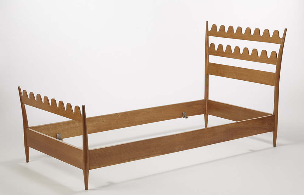 Paolo Buffa (Milano 1903 - 1970) Letto in legno massello di rovere con testiera a doghe intagliate a ondine. Italia, primi anni 40 (cm 201x105x100) (difetti) Provenienza: Ca' del Fogher, Cortina d'Ampezzo, 1936, progettata dall'architetto Pier Giulio Magistretti Accompagnato da certificazione di autenticità dell'Archivio Paolo Buffa Bed. Oak. Italy, early 1940s (cm 201x105x100) (defects) Provenance: Ca' del Fogher, Cortina d'Ampezzo, 1936, designed by Pier Giulio Magistretti Certificate of authenticity included.