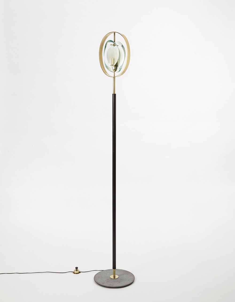 Max Ingrand ( 1908 - 1969) Lampada da terra modello "2020". Produzione Fontana Arte, anni 60. Cristallo molato di forte spessore con scavo opaco e montatura in ottone zapponato. Base in alluminio e stelo in metallo verniciato nero (h cm 170) (lievi difetti e restauri) Bibliografia: F. Deboni, Fontana Arte. Gio Ponti, Pietro Chiesa, Max Ingrand, Allemandi, 2012, fig. 388; "Quaderni Fontana Arte", n. 6, 1964, p. 106, cod. 2020; Illuminazione, "Quaderni Fontana Arte", n. 1, s.d., p. 74 Floor lamp model "2020". Produced by Fontana Arte, 1960s. Crystal, brass, aluminium, black lacquered metal (h cm 170) (minor defects and restorations) Bibliography: F. Deboni, Fontana Arte. Gio Ponti, Pietro Chiesa, Max Ingrand, Allemandi, 2012, fig. 388; "Quaderni Fontana Arte", n. 6, 1964, p. 106, cod. 2020; Illuminazione, "Quaderni Fontana Arte", n. 1, s.d., p. 74