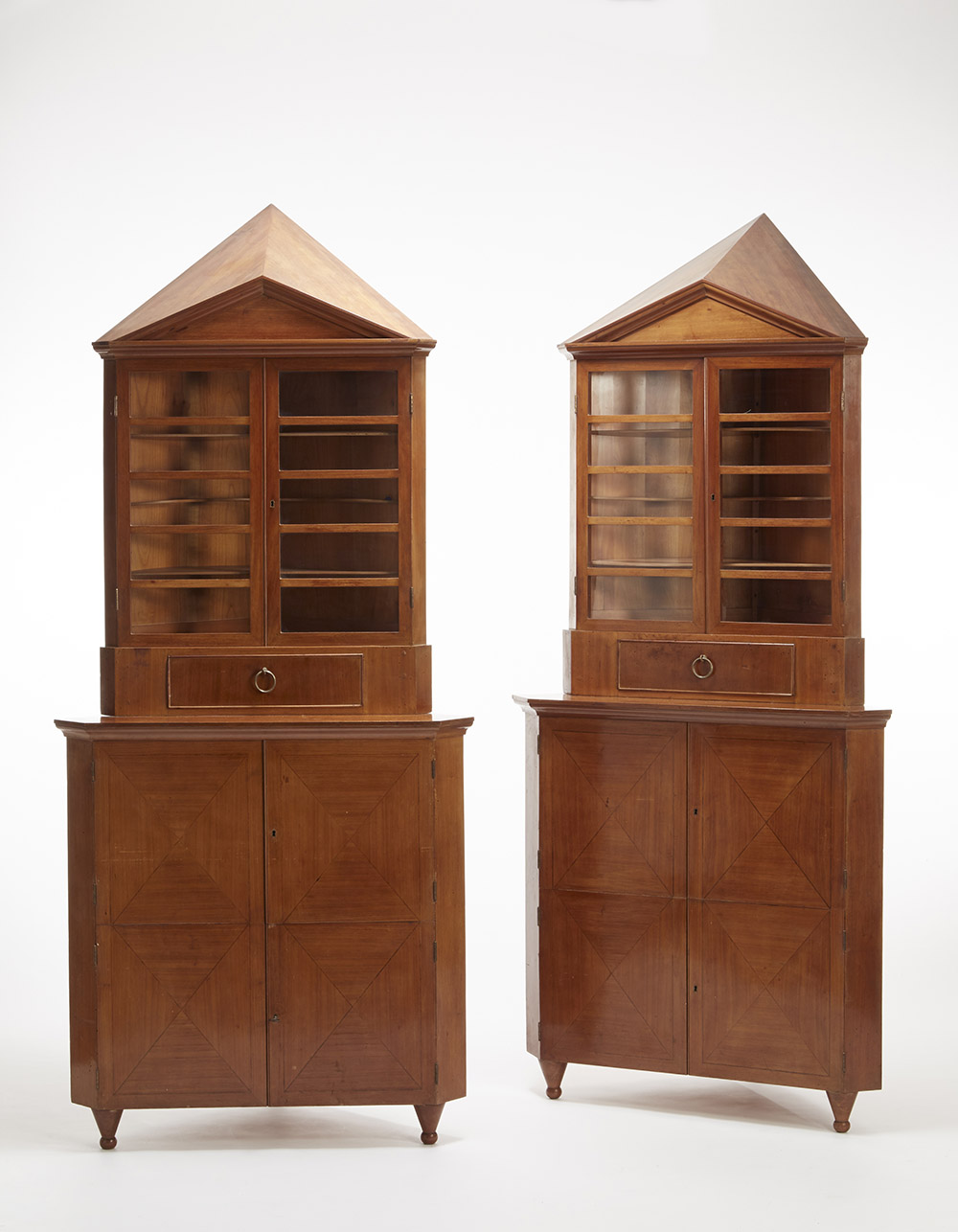Giovanni Muzio (Milano 1893 -Milano 1982) Coppia di cantonali su disegno, raro esempio di arredo in stile Novecento Milanese. Struttura architettonica in legno di ciliegio, composta da un basamento a quattro ante riquadrate e filettate, su gambe troncoconiche rovesciate e terminanti in una sfera. Alzata a due ante a vetri coronata da timpano su cornice e cuspide a due falde. Milano, 1928 (cm 97x206x60) (lievi difetti) Provenienza: Arredi per casa Berla, Milano Pair of corner cabinets. Cherry wood. Milan, 1928 (cm 97x206x60) (minor defects) Provenance: Arredi per casa Berla, Milan
