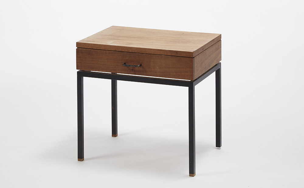 BBPR (Lodovico Barbiano di Belgiojoso, Enrico Peressutti, Ernesto Nathan Rogers) Comodino con struttura in acciaio brunito, corpo impiallacciato in legno di noce, piedini in massello di noce. Milano, 1952 ca. (cm 50x49x35) (lievi difetti e mancanze) Provenienza: Appartamento Z.P., Milano, 1952 e 1962 ca. Bedside table. Burnished steel, walnut wood. Milan, circa 1952 (cm 50x49x35) (minor defects and losses) Provenance: Appartamento Z.P., Milano, 1952 e 1962 ca.