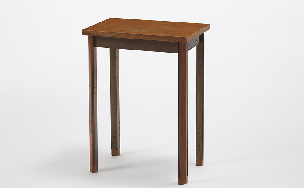 BBPR (Lodovico Barbiano di Belgiojoso, Enrico Peressutti, Ernesto Nathan Rogers) Piccolo tavolo con struttura in legno massello di noce accoppiato a piastre di ottone. Piano impiallacciato in noce. Esecuzione Pierino Frigerio, Cantù, 1962 ca. (cm 45x59x28) (lievi difetti) Provenienza: Appartamento Z.P., Milano, 1952 e 1962 ca. Table. Oak wood, brass. Pierino Frigerio, Cantù, circa 1962 (cm 45x59x28) (minor defects) Provenance: Appartamento Z.P., Milano, 1952 e 1962 ca.