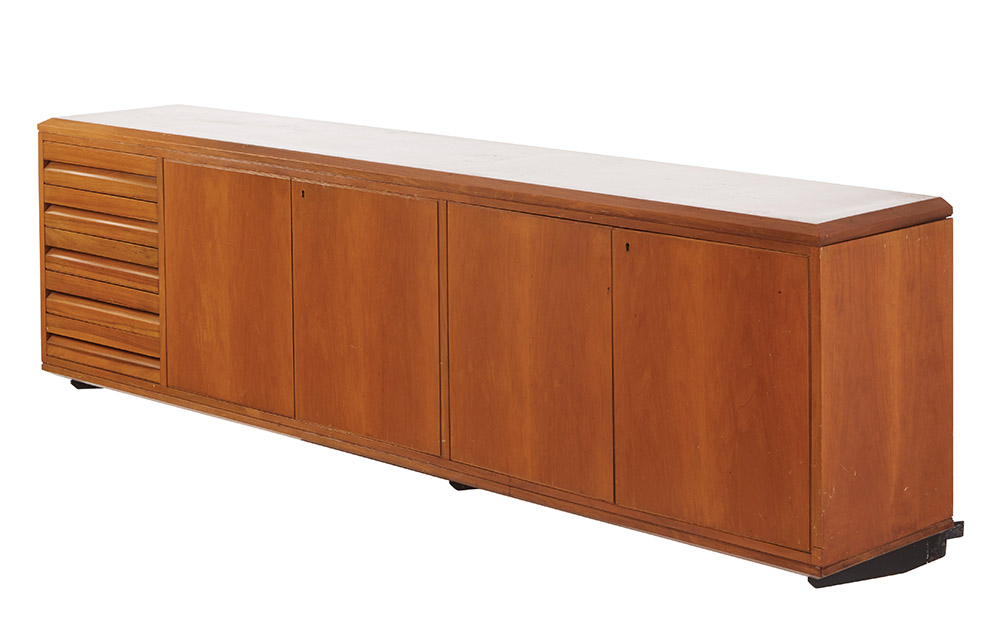 BBPR (Lodovico Barbiano di Belgiojoso, Enrico Peressutti, Ernesto Nathan Rogers) Credenza pensile a quattro ante e cinque cassetti, impiallacciata in legno di noce, retta da tre zanche in acciaio brunito da murare a parete. Milano 1962 ca. (cm 260x70x45) (lievi difetti) Provenienza: Appartamento Z.P., Milano, 1952 e 1962 ca. Veneered oak cabinet. Four doors and five drawers. Milan, circa 1962 (cm 260x70x45) (minor defects) Provenance: Appartamento Z.P., Milano, 1952 e 1962 ca.