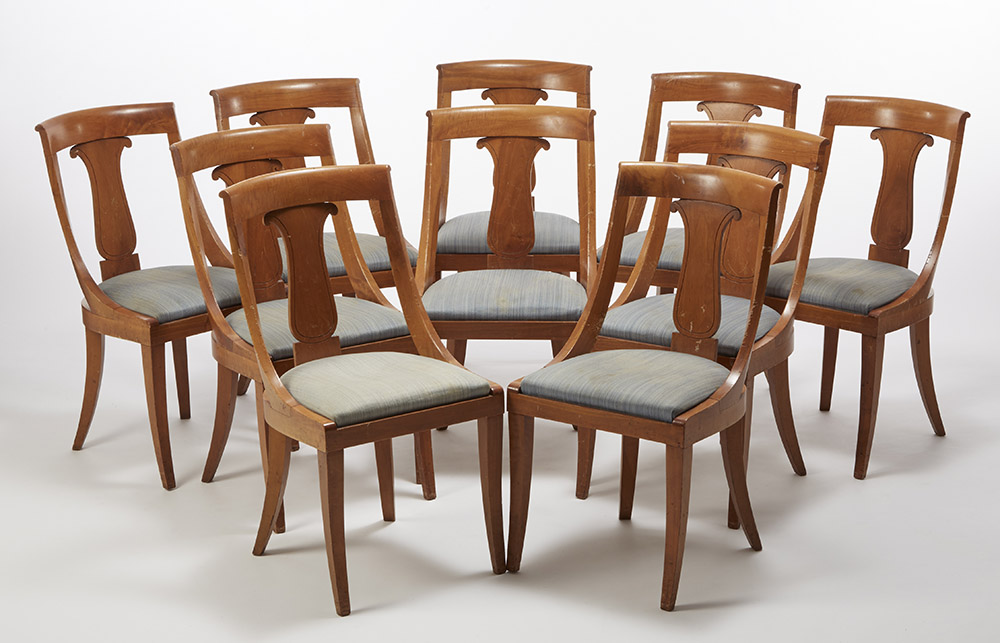 Dieci sedie a gondola di gusto ottocentesco, disegnate a citare le originali d'epoca. Legno massello di noce, esecuzione Pierino Frigerio, Cantù 1962 ca. (cm 45,5x85x42) (lievi difetti) Provenienza: Appartamento Z.P., Milano, 1952 e 1962 ca. Ten oak chairs. Pierino Frigerio, Cantù, circa 1962 (cm 45,5x85x42) (minor defects) Provenance: Appartamento Z.P., Milano, 1952 e 1962 ca.