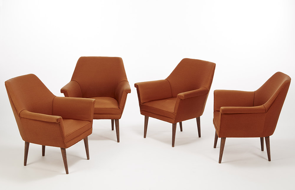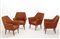 BBPR (Lodovico Barbiano di Belgiojoso, Enrico Peressutti, Ernesto Nathan Rogers) Quattro poltroncine imbottite, con struttura in legno di noce, gambe tornite troncoconiche, rivestimento in tessuto color mattone. Milano, 1962 ca. (cm 69x78x63 l'una) (lievi difetti) Provenienza: Appartamento Z.P., Milano, 1952 e 1962 ca Four armchairs. Oak structure, fabric lining. Milan, circa 1962 (cm 69x78x63 each) (minor defects) Provenance: Appartamento Z.P., Milano, 1952 e 1962 ca