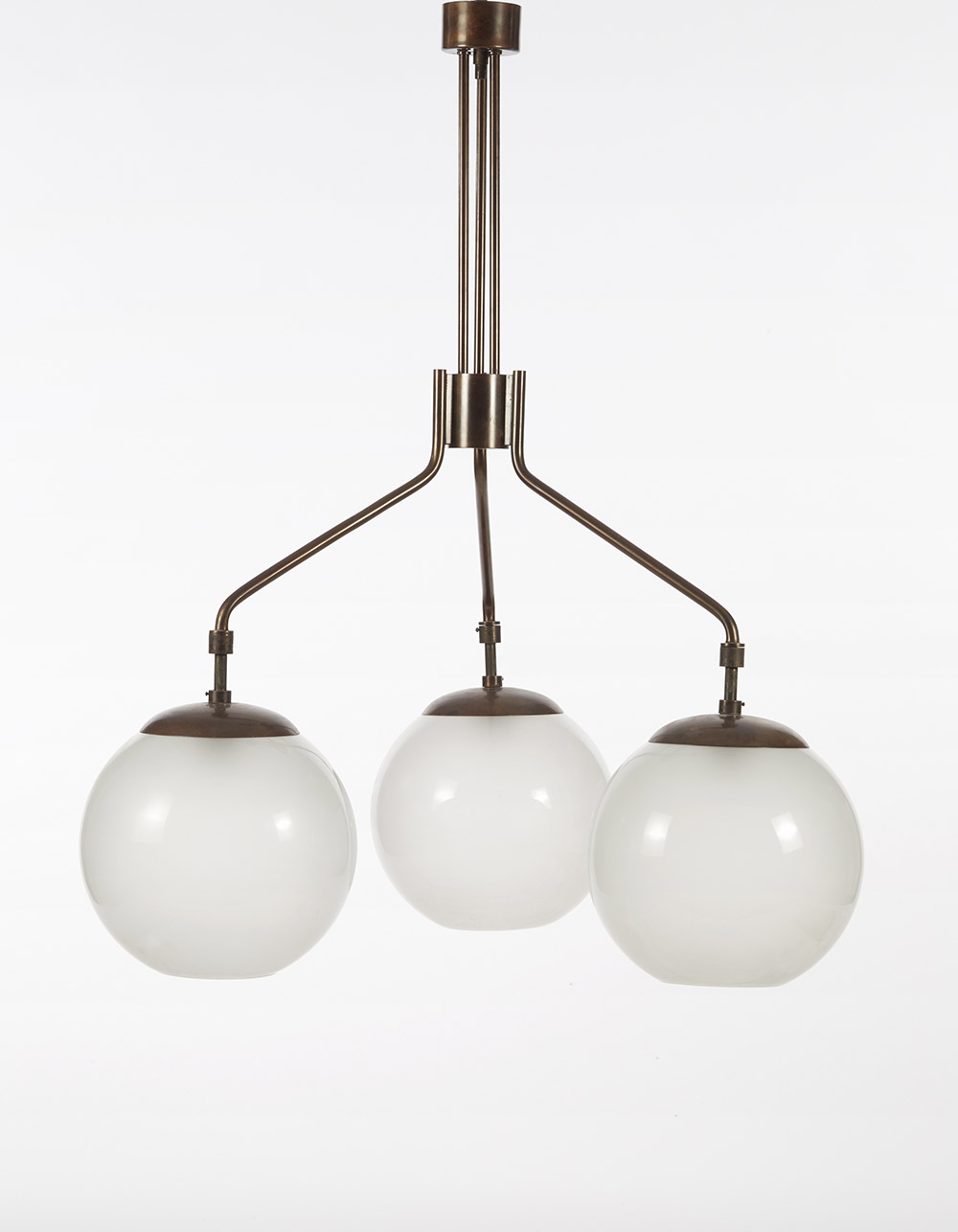 BBPR (Lodovico Barbiano di Belgiojoso, Enrico Peressutti, Ernesto Nathan Rogers) Lampada a sospensione a tre luci con struttura in ottone brunito e diffusori a globo in vetro soffiato sabbiato sulla superficie interna. Milano, 1962 ca. (h cm 106) (lievi difetti) Provenienza: Appartamento Z.P., Milano, 1952 Three lights ceiling lamp. Burnished brass, glass. Milan, circa 1962 (h cm 106) (minor defects) Provenance: Appartamento Z.P., Milano, 1952