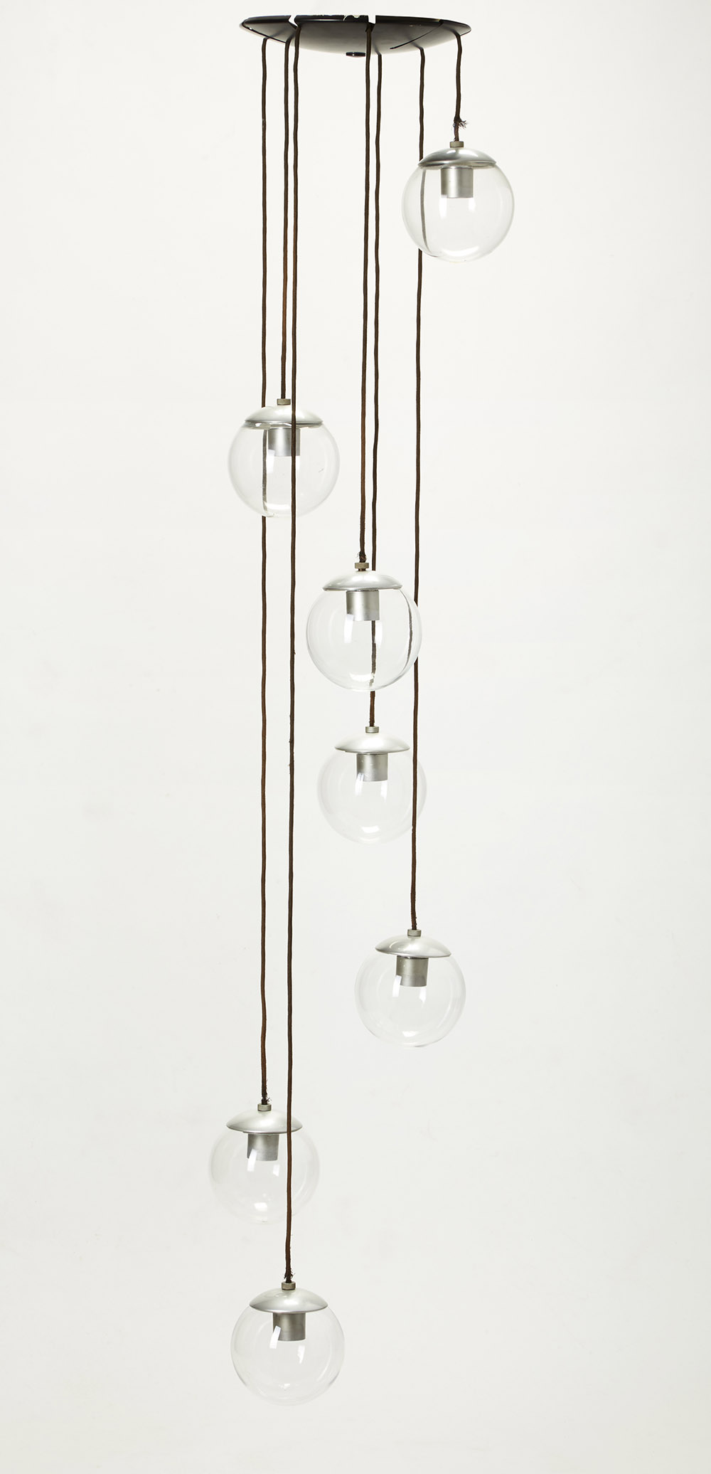 Gino Sarfatti ( 1912 - 1985) Lampadario a sette luci pendenti modello "2095/7". Produzione Arteluce, Milano 1958. Metallo laccato nero perlato, sfere in vetro incolore (d cm 30, h cm 180) (lievi difetti)