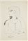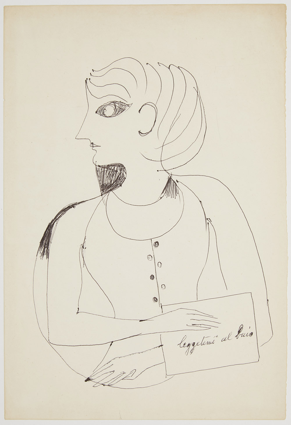 Gio Ponti (Milano 1891 - 1979) "Leggetemi al buio", disegno raffigurante una donna reggente un cartiglio. Penna su carta. In cornice (cm 30,5x21) Provenienza: Collezione Privata, Milano "Leggetemi al buio", drawing depicting a woman. Pen on paper. Framed. (cm 30,5x21) Provenance: private collection, Milan