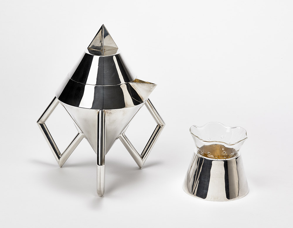 Carla Venosta (1926) Tisaniera modello "Samo", collezione "I-DEA". Esecuzione Faraone-Tiffany, Milano-New York 1994-1995. Ottone argentato. Composta da contenitore e infusore con tazza in cristallo forato (h cm 30) (lievi difetti) Esposizioni: un esemplare fa parte della collezione permanente del Museo del Design Italiano alla Triennale di Milano Bibliografia: P. Preti e C. Venosta, Architettonicamente, s.e., Milano 2012, pp. 42, 108-109; Nientedimeno / Nothing less. la forza del design femminile, a cura d A. Pansera con M. Chirico, Allemandi, Torino 2011, pp. 56-57; P. Preti e C. Venosta, Carla Venosta. 30 progetti di disegno industriale italiano, Electa, Milano 2007, pp. 172-175; International Design Review 1997. Industrial architectural and interior design, Action Group, 1997, p. 399 Herb tea set, model "Samo", collection "I-DEA". Faraone-Tiffany, Milano-New York 1994-1995. Silver-plated brass. (h cm 30) (minor defects) Bibliography: P. Preti e C. Venosta, Architettonicamente, s.e., Milano 2012, pp. 42, 108-109; Nientedimeno / Nothing less. la forza del design femminile, a cura d A. Pansera con M. Chirico, Allemandi, Torino 2011, pp. 56-57; P. Preti e C. Venosta, Carla Venosta. 30 progetti di disegno industriale italiano, Electa, Milano 2007, pp. 172-175; International Design Review 1997. Industrial architectural and interior design, Action Group, 1997, p. 399
