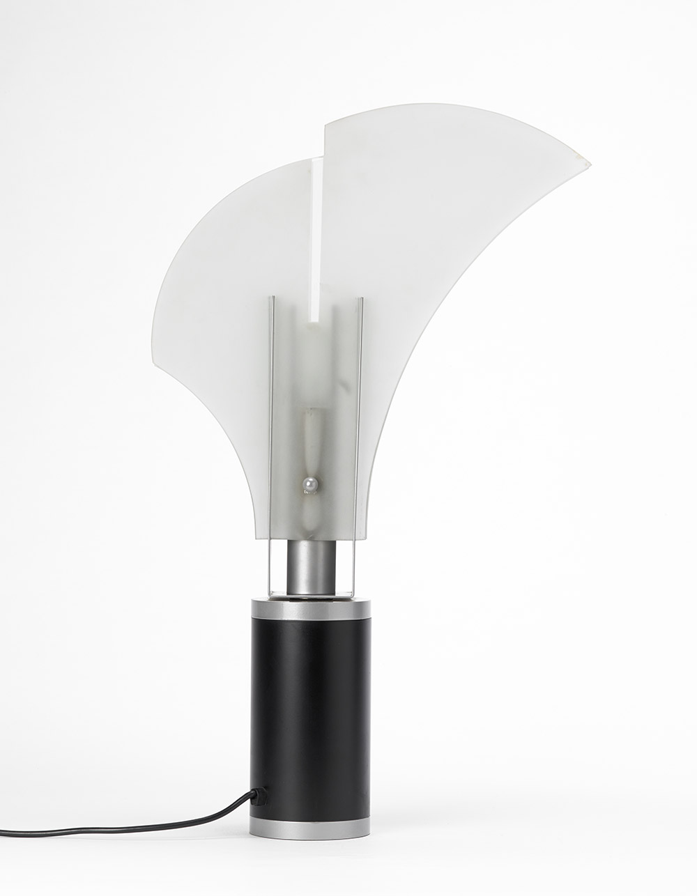 Carla Venosta (1926) Lampada da tavolo modello "Mezzo Alfiere". Produzione Quattrifolio, Milano 1988. Struttura in metallo verniciato nero, finitura in grigio metallizzato. Diffusori in cristallo naturale sabbiato (h cm 66) (difetti) Bibliografia: Catalogo Quattrifolio novità 1989 Floor lamp, model "Mezzo Alfiere". Produced by Quattrifolio, Milano 1988. Black lacquered metal, crystal. (h cm 66) (defects) Bibliography: Catalogo Quattrifolio novità 1989