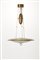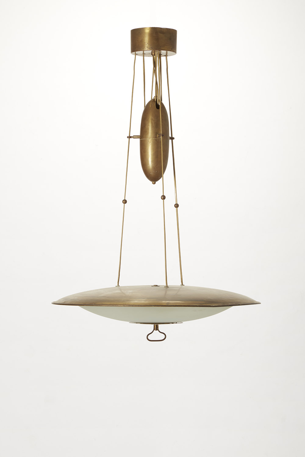 Gino Sarfatti (attribuito) Lampada a saliscendi in ottone con calotta a disco e diffusore in vetro acidato. Probabile produzione Arteluce, Milano anni 40 (h cm 100, d cm 65) (lievi difetti) Pendant ceiling light. Brass and glass. Probable manufacture by Arteluce, Milan 1940s (h cm 100, d cm 65) (very small defects)