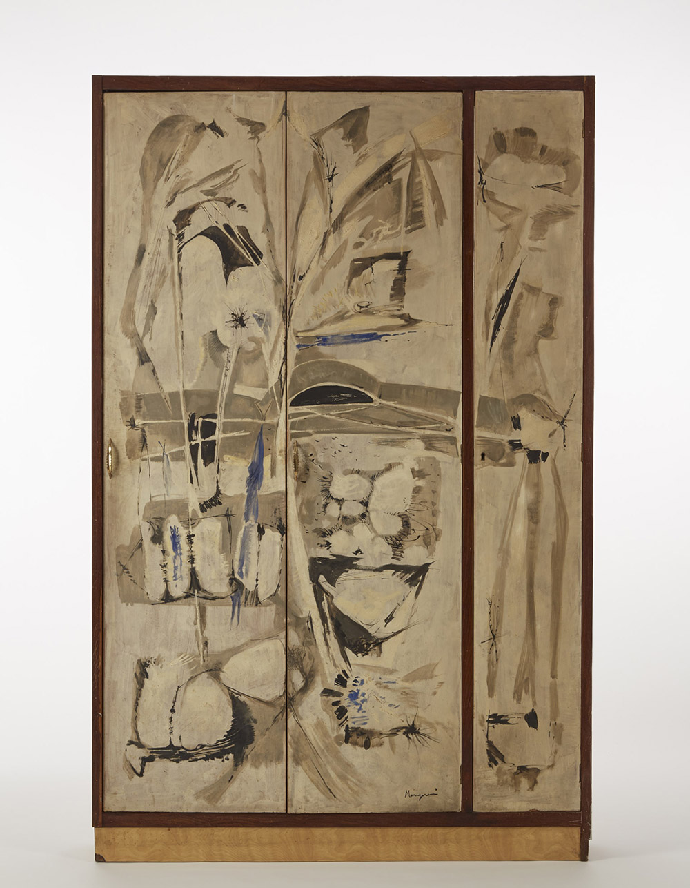 Carlo Nangeroni (New York 1922) "Senza titolo", dipinto a olio eseguito sul fronte di un mobile da ingresso a tre ante. Milano 1958 ca. Firmato in basso a destra sull'anta centrale (cm 140x219x25) (difetti) Provenienza: collezione privata, Milano Untitled oil painting on a three doors cabinet. Milano, circa 1958. Signed and dated (cm 140x219x25) (defects) Provenance: private collection, Milano