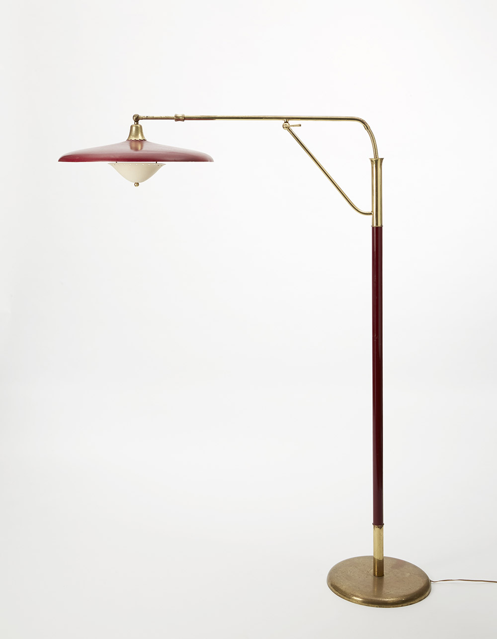 Angelo Lelii ( 1911 - 1979) Lampada da terra. Produzione Arredoluce, Monza anni 50. Ottone lucidato e alluminio laccato bordeaux. Marchio "Arredoluce - Monza Italy 13000" in fusione di ghisa sotto la base. (h max 170) (lievi difetti) Bibliografia: A. Koch, Neuzeitiche leuchten der 50er Jahre, Arnoldsche, Stuttgart 2012, p. 47 Floor lamp. Produced by Arredoluce, Monza 1950s. Brass and bordeaux lacquered aluminum. Marked under the base "Arredoluce - Monza Italy 13000". (h max 170) (minor defects) Bibliography: A. Koch, Neuzeitiche leuchten der 50er Jahre, Arnoldsche, Stuttgart 2012, p. 47
