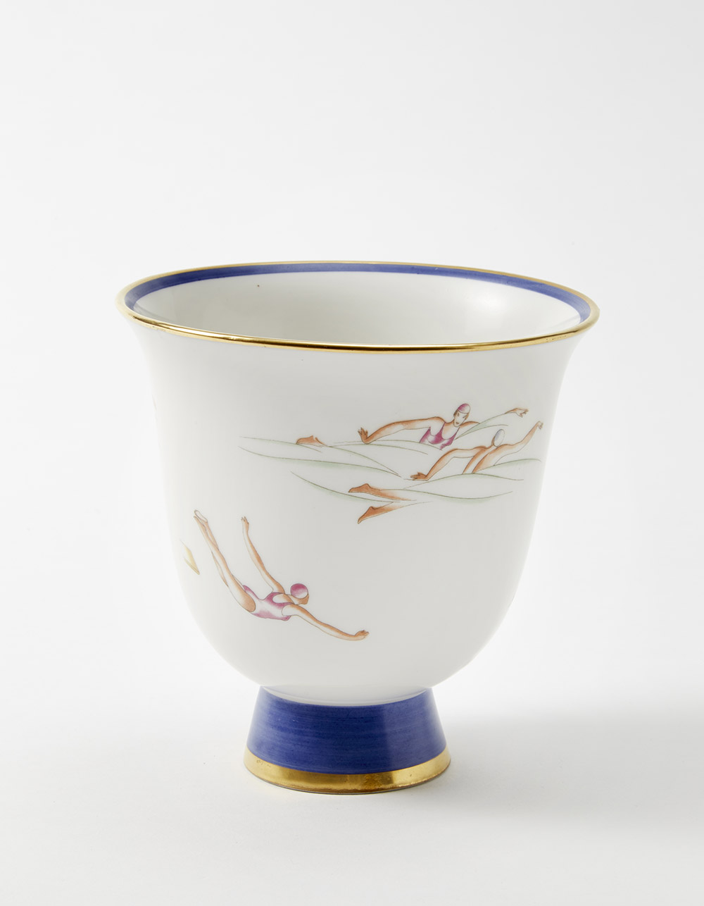 Gio Ponti (Milano 1891 - 1979) Coppa a campana rovesciata su base troncoconica, in porcellana bordata in oro, smaltata in policromia sotto vetrina con decori della serie "Gli Sport", raffiguranti sport acquatici. Manifattura Richard - Ginori, Pittoria di Doccia, anni 30. Marcato in verde "Richard-Ginori MADE IN ITALY" e con numerali "37 6" (h. cm 14,4) Bibliografia per esemplare simile: P. Portoghesi, A Pansera, Gio Ponti alla manifattura di Doccia, SugarCo Edizioni, Milano 1982, p. 90 Porcelain bowl, "Gli Sport" decorations, gold surround. Richard - Ginori, Pittoria di Doccia, anni 30. Marcato in verde "Richard-Ginori MADE IN ITALY" e con numerali "37 6" (h. cm 14,4) Bibliography for similar bowl: P. Portoghesi, A Pansera, Gio Ponti alla manifattura di Doccia, SugarCo Edizioni, Milano 1982, p. 90