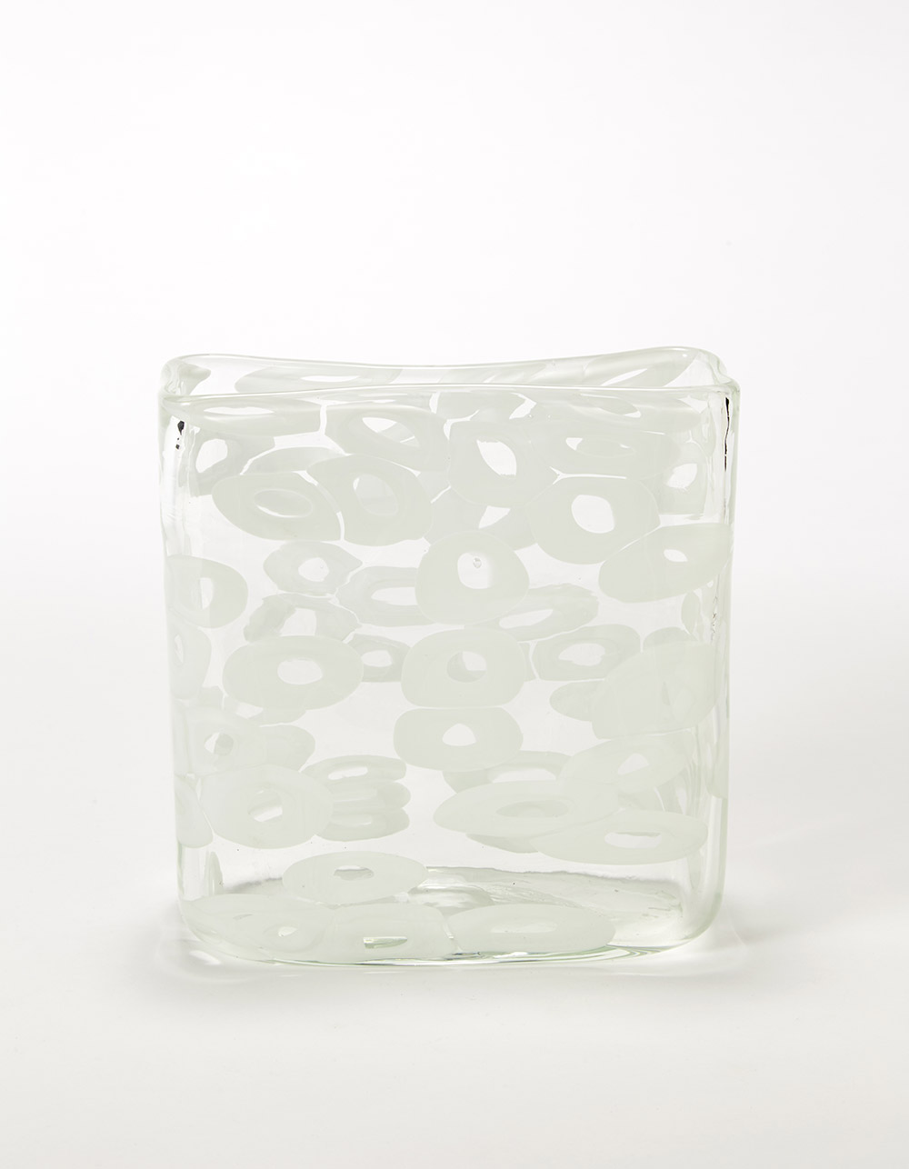 Fulvio Bianconi ( 1915 - 1996) Vaso modello "S 504". Vistosi, Murano 1962 ca. Vetro incolore a murrine bianche sagomato a forma quadrangolare inflessa (h cm 21) Bibliografia per esemplari simili: M. Heiremans, Art Glass From Murano 1910-1970, Arnoldsche, Stuttgart 1993, p. 303, fig. 252; M. Heiremans, Murano glas 1945-1970, Galerij Novecento, 1989, fig. 229 Vase model "S 504". Vistosi, Murano circa 1962. Clear glass and white murrhine decorations. (h cm 21)