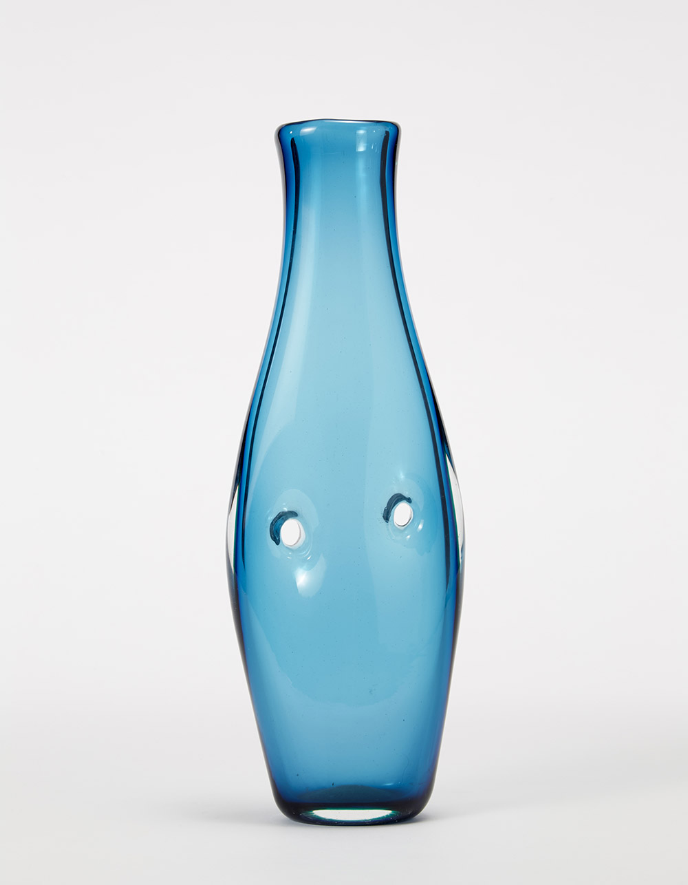 Fulvio Bianconi ( 1915 - 1996) Vaso della serie "Forati o buchi". Venini, Murano 1951-52. Firmato all'acido "venini murano ITALIA". Sezione ovale e collo allungato in vetro composto "oceano", forato con coppia di buchi circolari ricavati nella parete dell'oggetto ad altezze diverse. Disegno n. 4520 del Catalogo Rosso Venini (h cm 44) Bibliografia: Fulvio Bianconi alla Venini, a cura di M. Barovier con C. Sonego, Skira, Milano 2015, p. 244; A. Venini Diaz de Santillana, Venini. Catalogo ragionato 1921-1986, Skira, Milano 2000, p. 281; M. Barovier, R. Barovier Mentasti, A. Dorigato, Il vetro di Murano alle Biennali 1895-1972, Leonardo Arte, Milano 1995, p. 77 Vase, series "Forati o buchi". Venini, Murano 1951-52. Signed "venini murano ITALIA". Glass. Design n. 4520 of the "Catalogo Rosso Venini" (h cm 44) Bibliography: Fulvio Bianconi alla Venini, a cura di M. Barovier con C. Sonego, Skira, Milano 2015, p. 244; A. Venini Diaz de Santillana, Venini. Catalogo ragionato 1921-1986, Skira, Milano 2000, p. 281; M. Barovier, R. Barovier Mentasti, A. Dorigato, Il vetro di Murano alle Biennali 1895-1972, Leonardo Arte, Milano 1995, p. 77