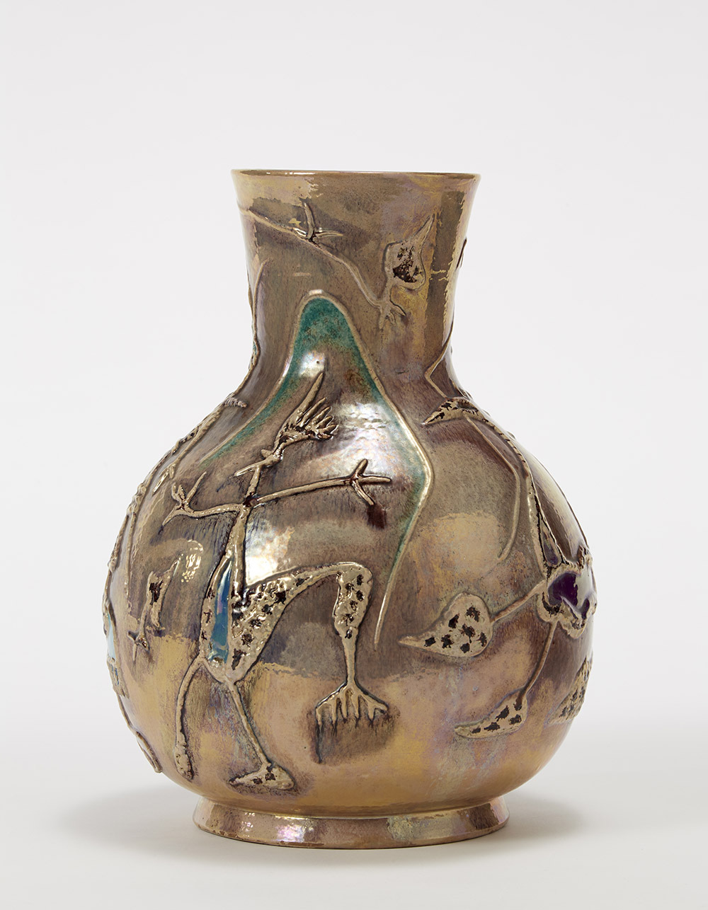Pietro Melandri (Faenza 1885 - 1976) Grande vaso bulbifome a collo leggermente aperto, in ceramica decorata con smalti policromi e lustri metallici sottovetrina nei troni del crema, verde, bruno, celeste, vinaccia. Decoro a rilievo a soggetto vegetale e zoomorfo. Firmato sotto la base in ocra "MELANDRI FAENZA". Anni 40 (h cm 42) Ceramic vase. Signed under the base "MELANDRI FAENZA". 1940s. (h cm 42)
