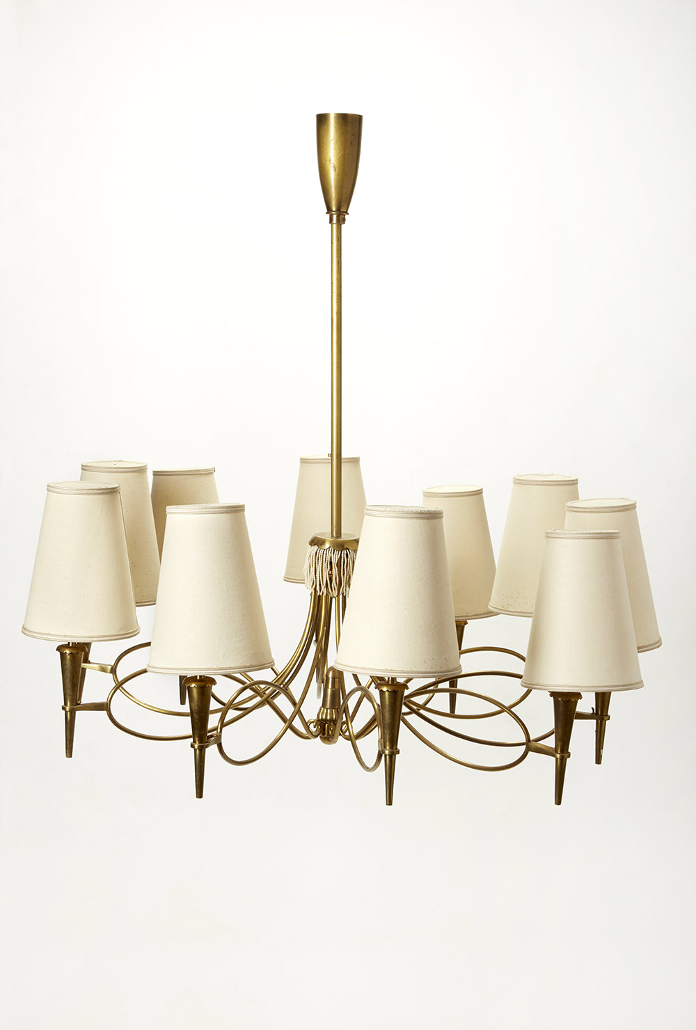 Gino Sarfatti (attribuito) Lampadario a dieci luci in ottone con braccia in tubolare piegato e portalampade in fusione. Paralumi in tessuto. Probabile produzione Arteluce, Milano anni 40 (h cm 102, d cm 110) (lievi difetti) Ten arm ceiling light. Brass, fabric. Probable manufacture Arteluce, Milan, 1940s (h cm 102, d cm 110) (minor defects)