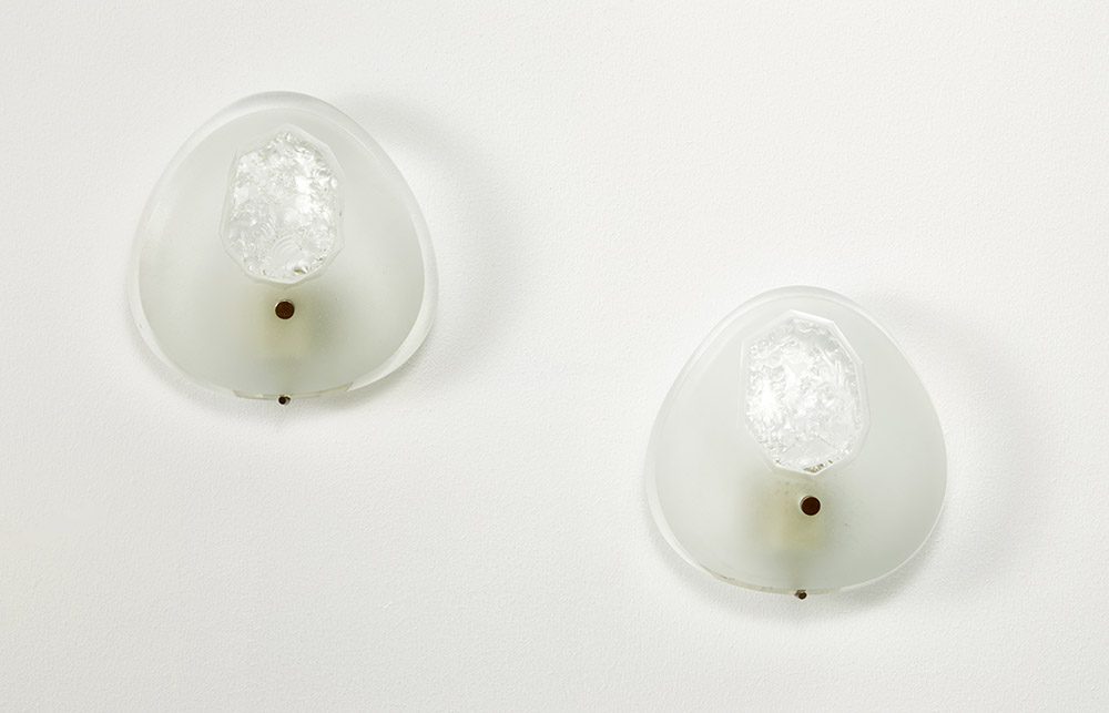 Max Ingrand ( 1908 - 1969) Coppia di appliques modello "1944". Produzione Fontana Arte, Milano anni 50. Metallo verniciato e cristallo molato, sabbiato e scalpellato (cm 20x20) (lievi difetti e restauri) Bibliografia: "Quaderni Fontana Arte", n. 6, s.d., p. 78 Pair of appliques, model "1944". Produced by Fontana Arte, Milano, 1950s. Lacquered metal, crystal. (cm 20x20) (minor defects and restorations) Bibliography: "Quaderni Fontana Arte", n. 6, s.d., p. 78