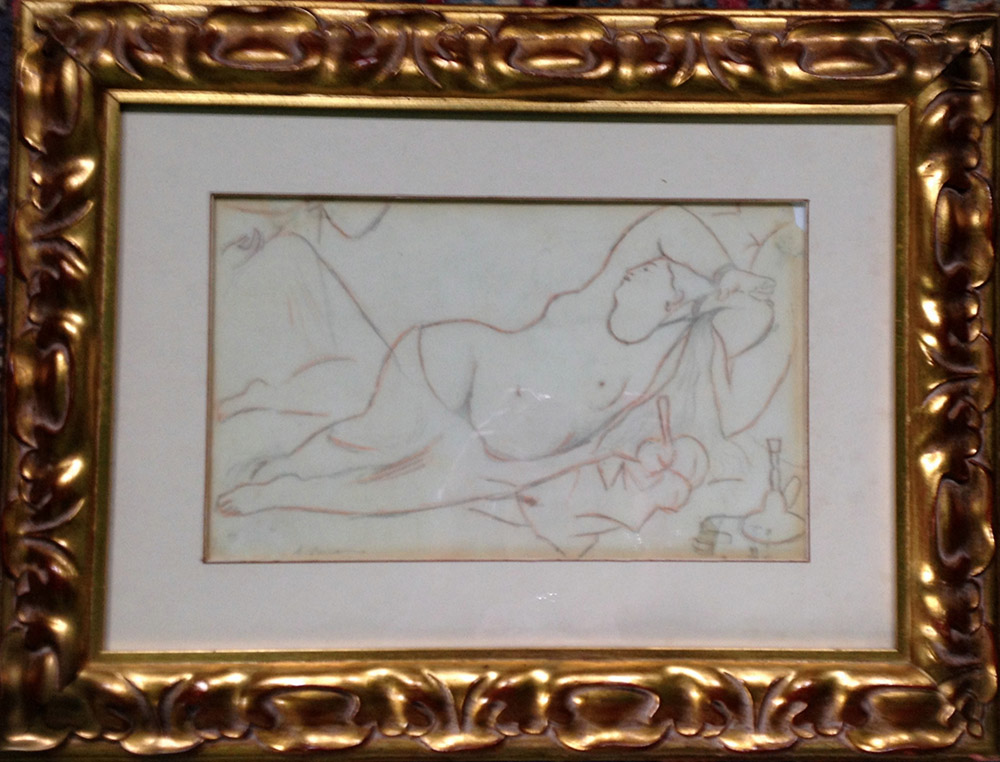 Antonio Bueno "Figura distesa" - Grafite e sanguigna su carta - cm 18,5x30 - Opera incorniciata - Firma in basso a sx - Autentica su foto Galleria Guastalla Milano