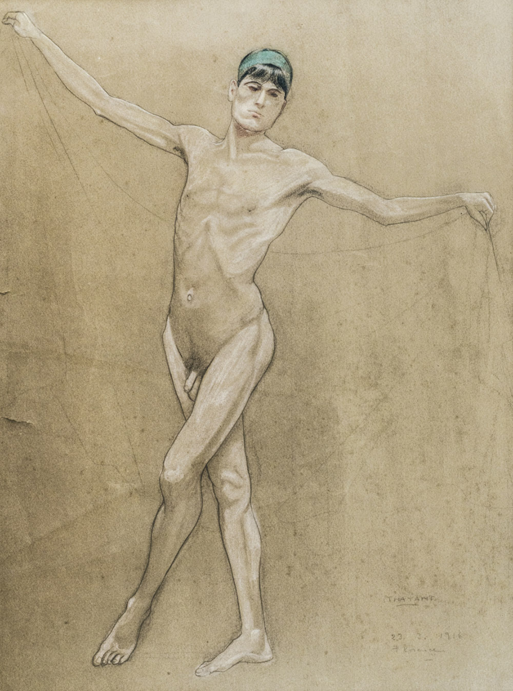 THAYAHT (Ernesto Michahelles) Firenze 1893 – Marina di Pietrasanta (LU) 1959 Danzatore, 1916 Tecnica mista su carta, 51 x 38 cm circa Firma, data e luogo in basso a destra: THAYAHT 23. 3. 1916 Florence Autentica su foto di Sandro Michahelles, Firenze 15 aprile 2015 Condition report Due piccoli tagli lungo il lato sinistro (senza mancanze) THAYAHT (Ernesto Michahelles) Florence 1893 – Marina di Pietrasanta (LU) 1959 Dancer, 1916 Mixed media on paper, 51 x 38 cm ca. Signed, dated and inscribed lower right: THAYAHT 23. 3. 1916 Florence Photo-certificate of authenticity by Sandro Michahelles, Florence, April 15th 2015 Condition report Two small defects on the left
