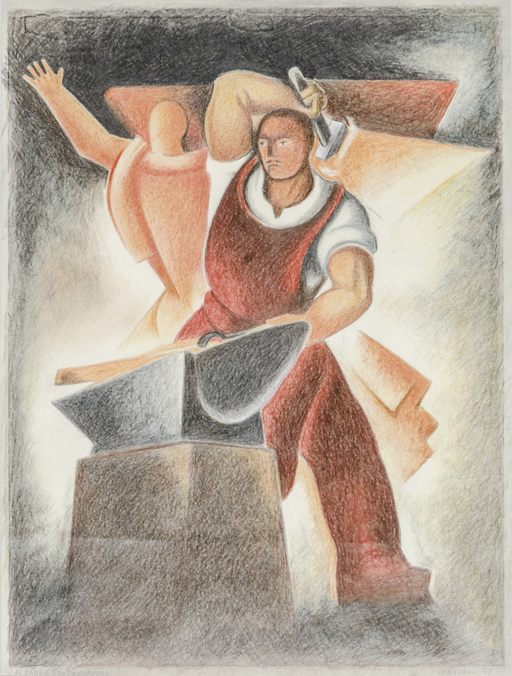 SILVIO CANEVARI Viterbo 1893 - Roma 1951 Il fabbro di Predappio, 1935 Pastelli su carta, 40 x 30 cm Firma e data in basso a destra: Canevari XIII Titolo in basso a sinistra: Il fabbro di Predappio SILVIO CANEVARI Viterbo 1893 - Rome 1951 The blacksmith of Predappio, 1935 Pastel on paper, 40 x 30 cm Signed and dated loer right: Canevari XIII Titled lower left: Il fabbro di Predappio
