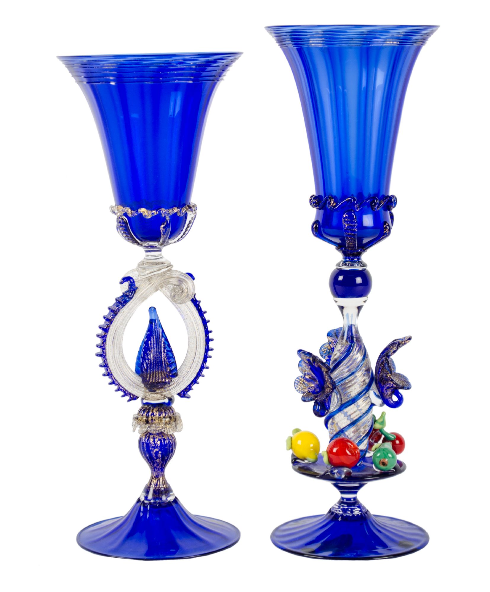 DUE BICCHIERI in vetro di Murano nei toni del blu. XX secolo Misure: h cm 28 - 29,5