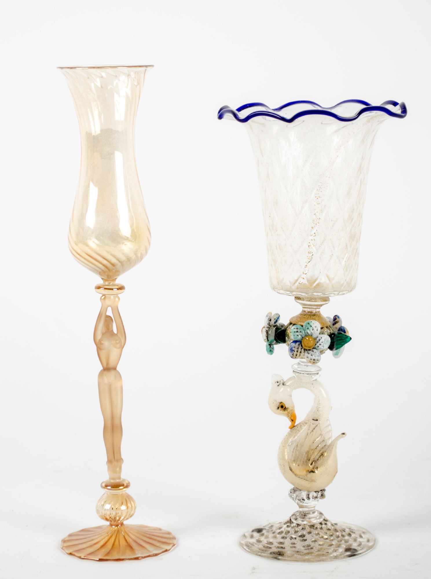 LOTTO composto da BICCHIERE in vetro di Murano con stelo a guisa di cigno e da BICCHIERE in vetro La Murrina con stelo raffigurante "nudo femminile". XX secolo Misure: h cm 27 - 29,5