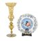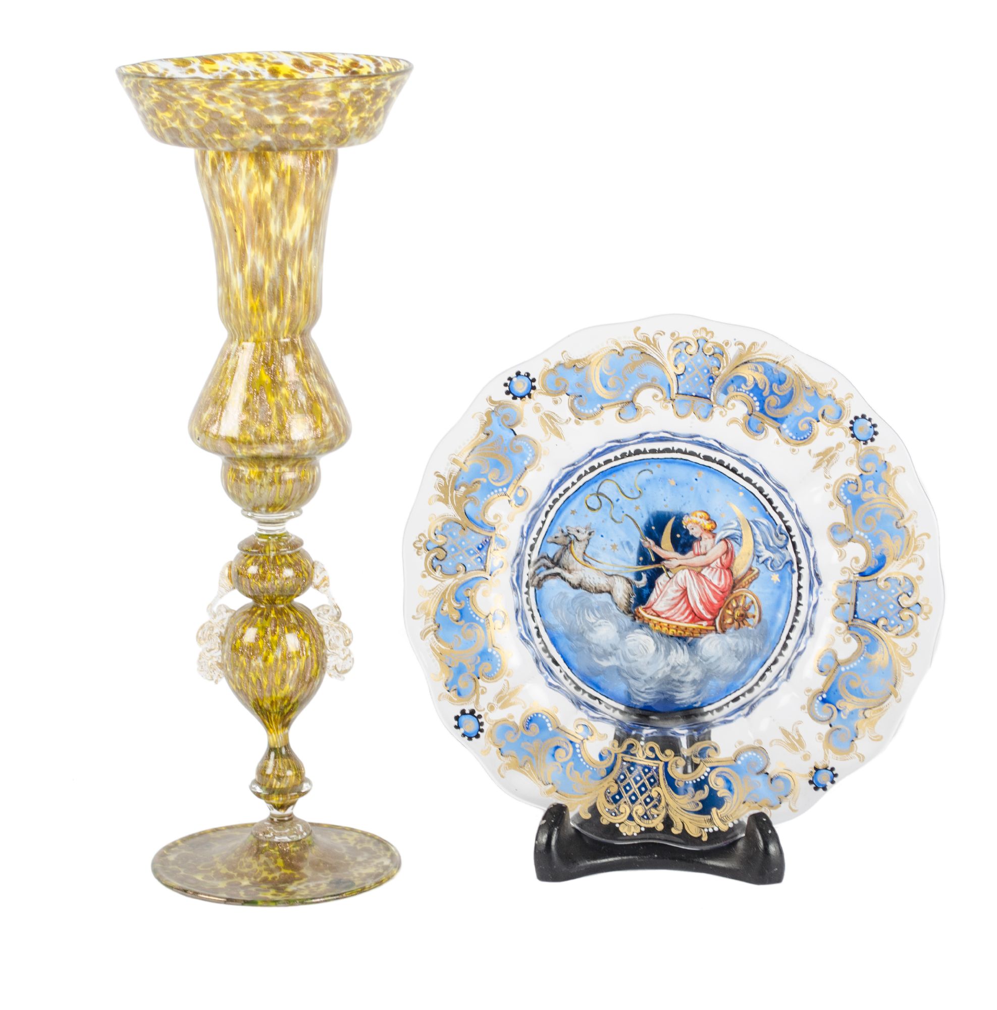 LOTTO composto da BICCHIERE in vetro verde e da PIATTINO in vetro di Murano dipinto raffigurante "figura mitologica". XX secolo Misure: varie