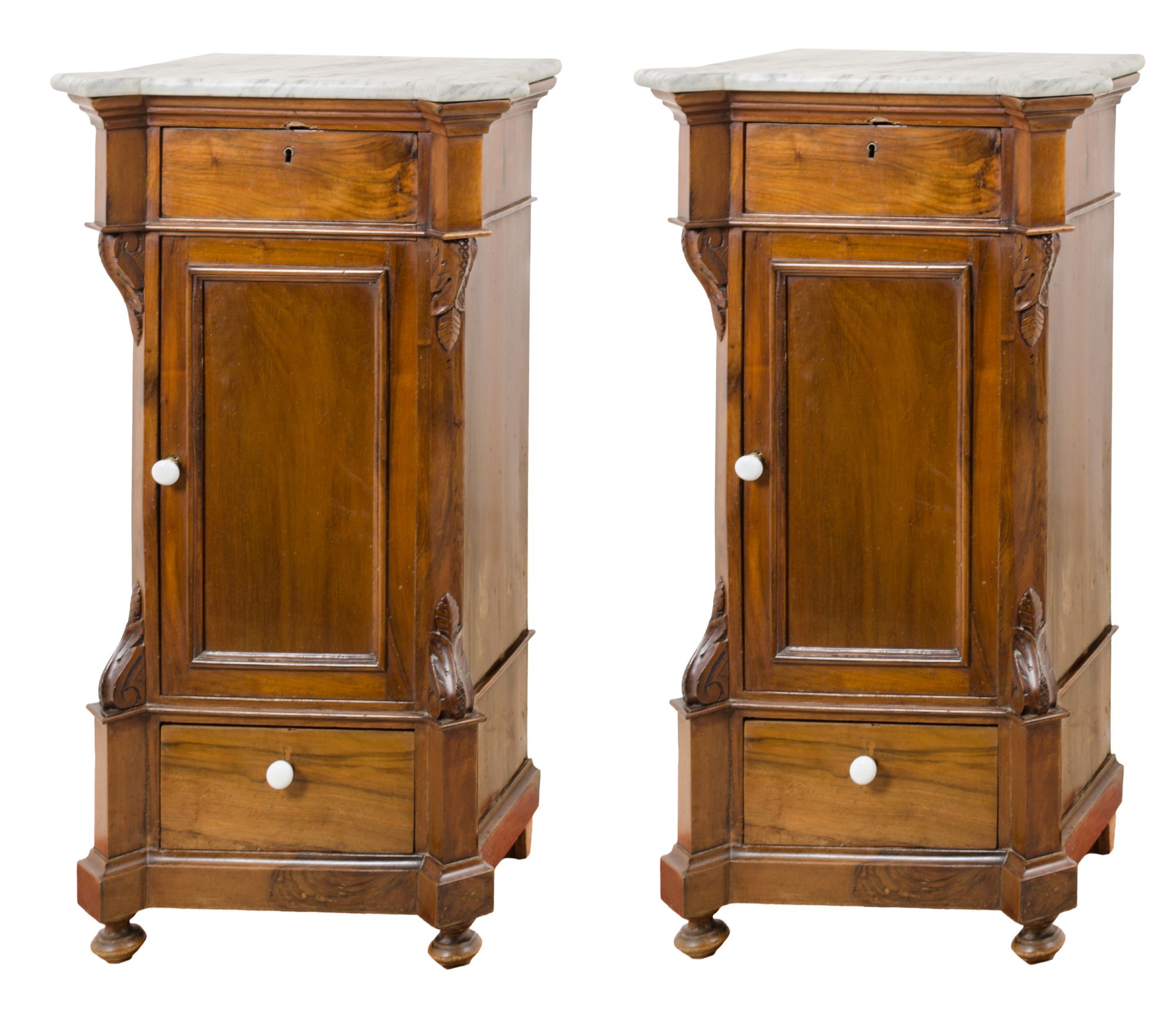 COPPIA COMODINI in noce con sportello centrale, cassetto superiore e cassetto inferiore, piano in marmo bianco venato. Sicilia XIX secolo Misure: cm 52 x 39 x h 92