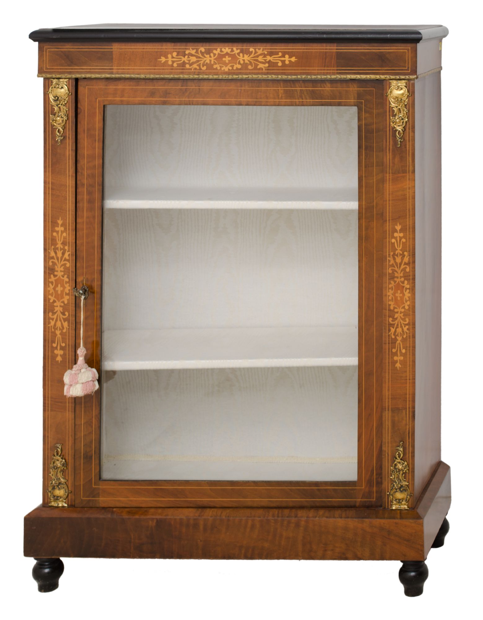 VETRINETTA ad un'anta in noce e radica di noce con tarsie in bosso e fregi in bronzo. Inghilterra XIX secolo Misure: cm 76 x 30 x h 104