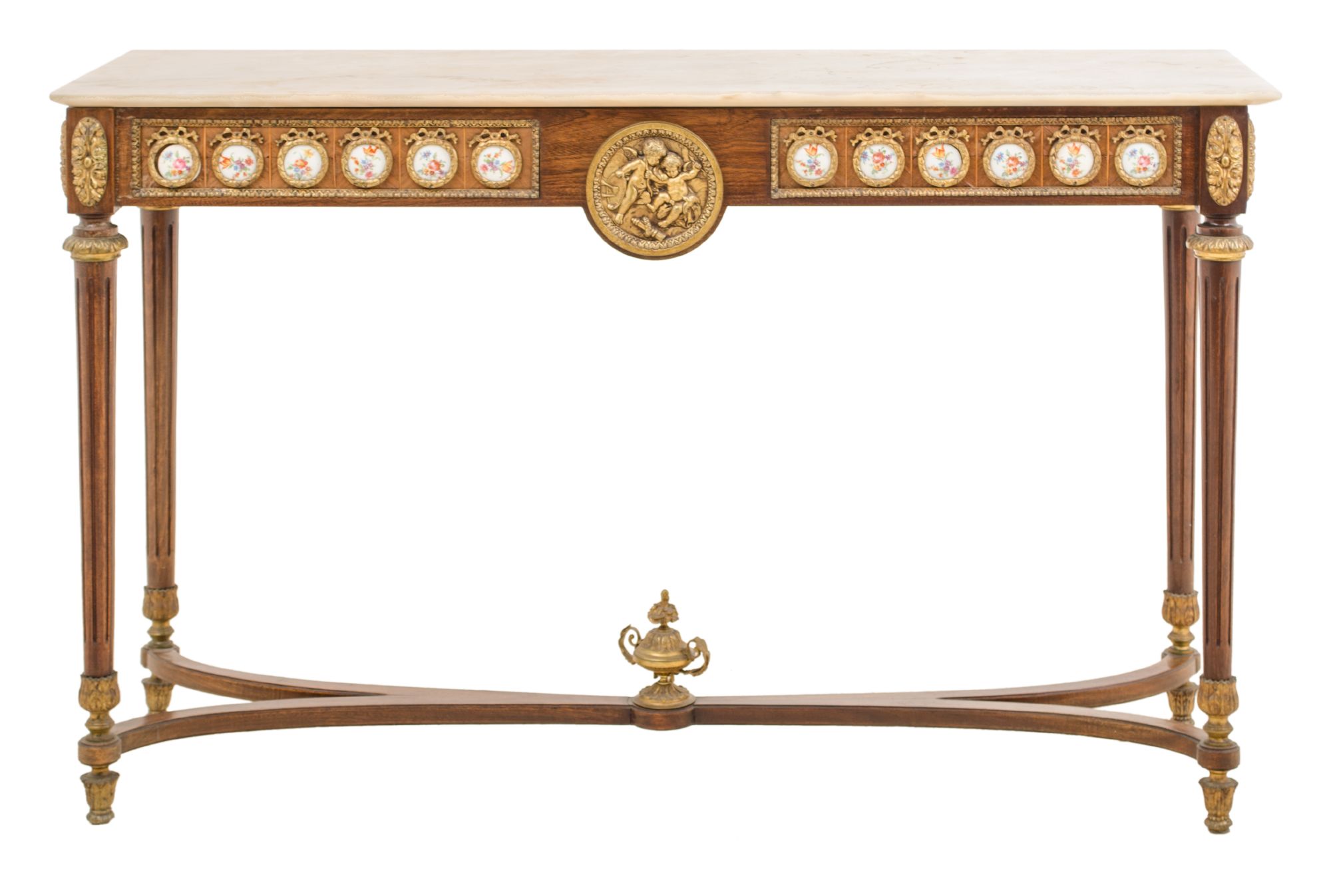 CONSOLE in mogano con placche tonde in porcellana dipinta a motivo floreale e applicazioni in bronzo, piano in marmo bianco. XX secolo Misure: cm 132 x 42 x h 82