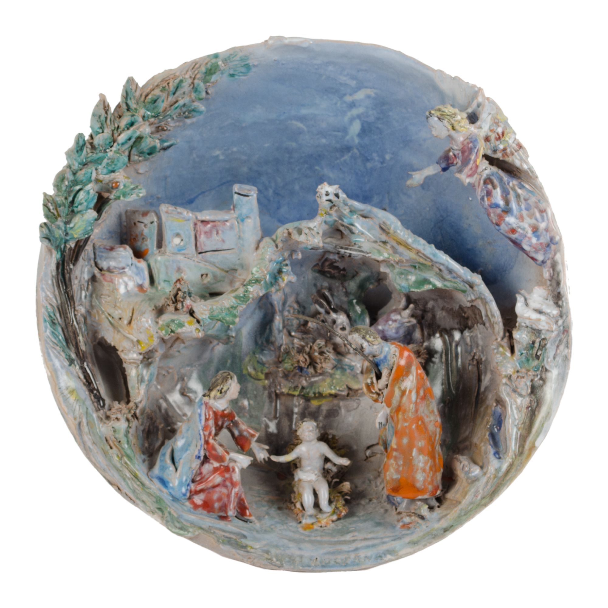 PRESEPE in ceramica smaltata e dipinta (lievi difetti). XX secolo Misure: diametro cm 24