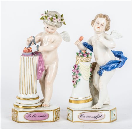 COPPIA SCULTURE in porcellana Meissen raffiguranti "angioletti" (lievi rotture). XX secolo Misure: h cm 14