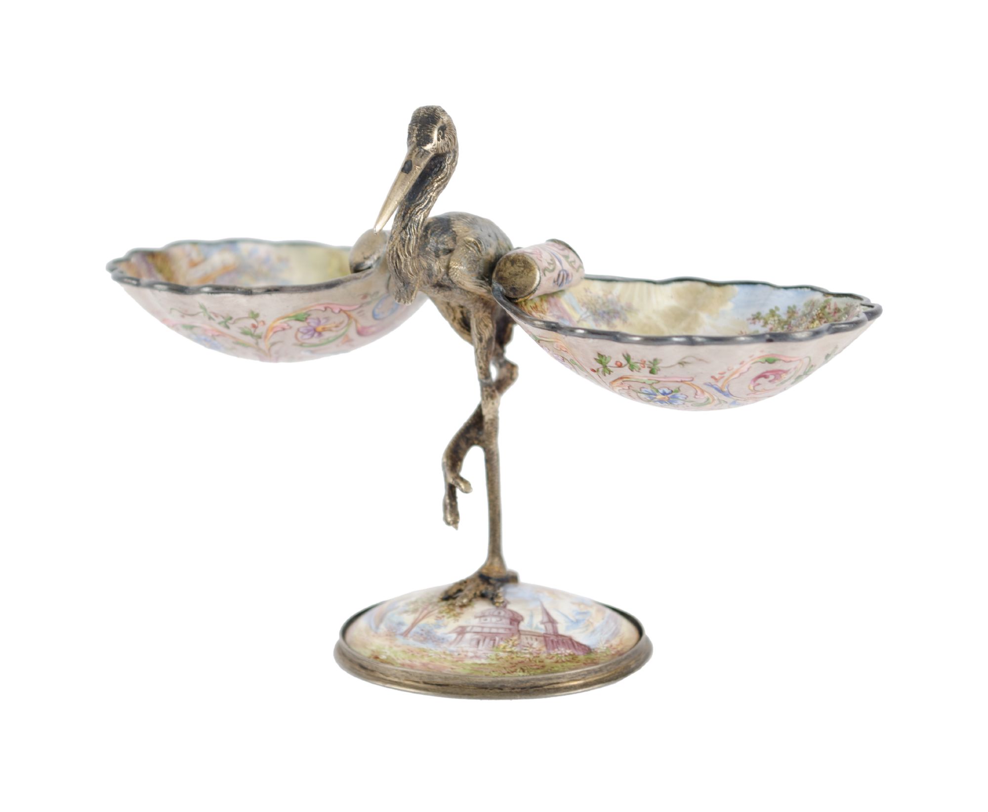 SALIERA con struttura in bronzo raffigurante "airone" e vaschette in cloisonnet raffiguranti "scene neoclassiche". Francia XIX secolo Misure: cm 13 x 9