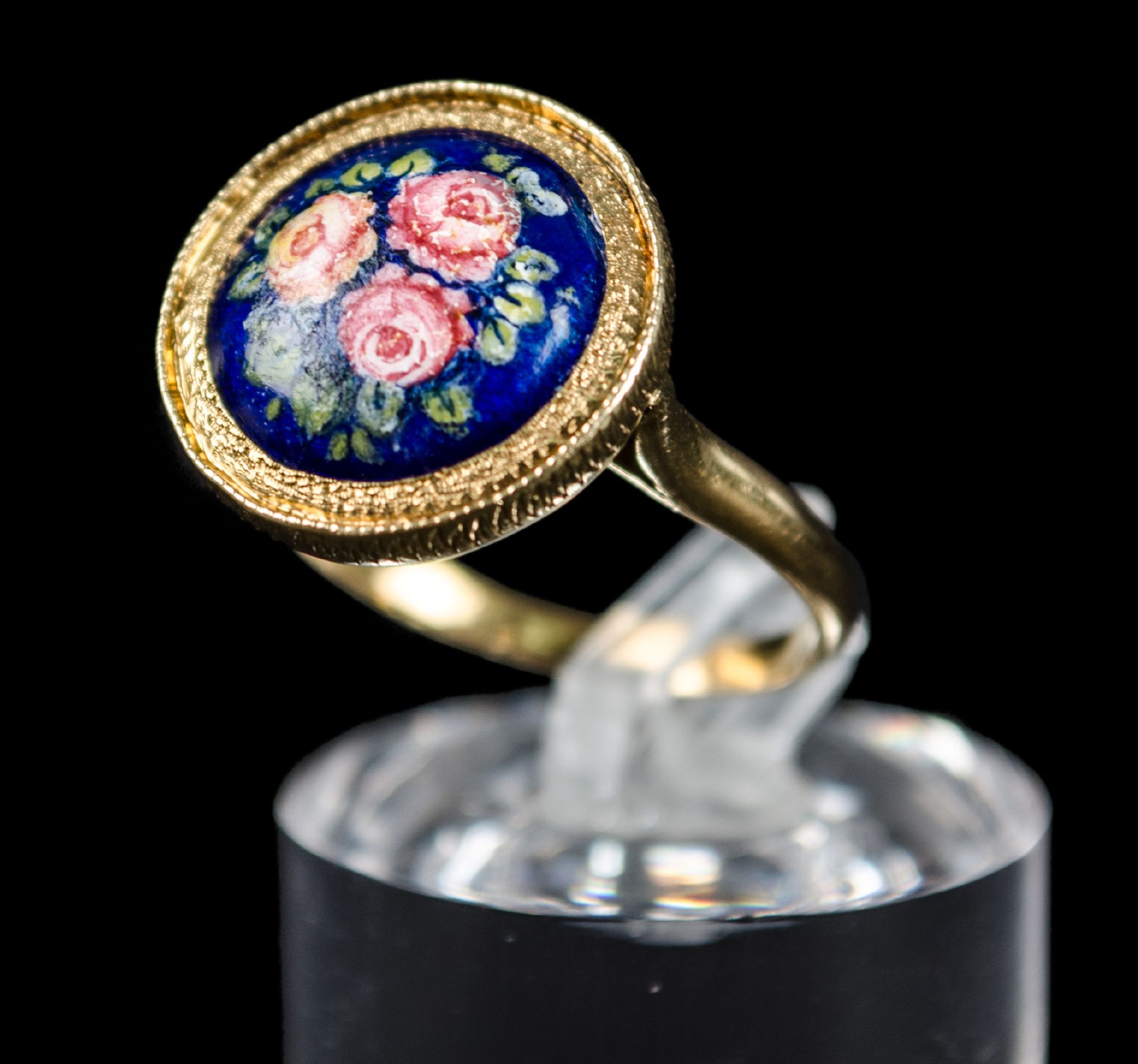 ANELLO in oro giallo 18 Kt. con piccolo medaglione smaltato a mano raffigurante "fiori".