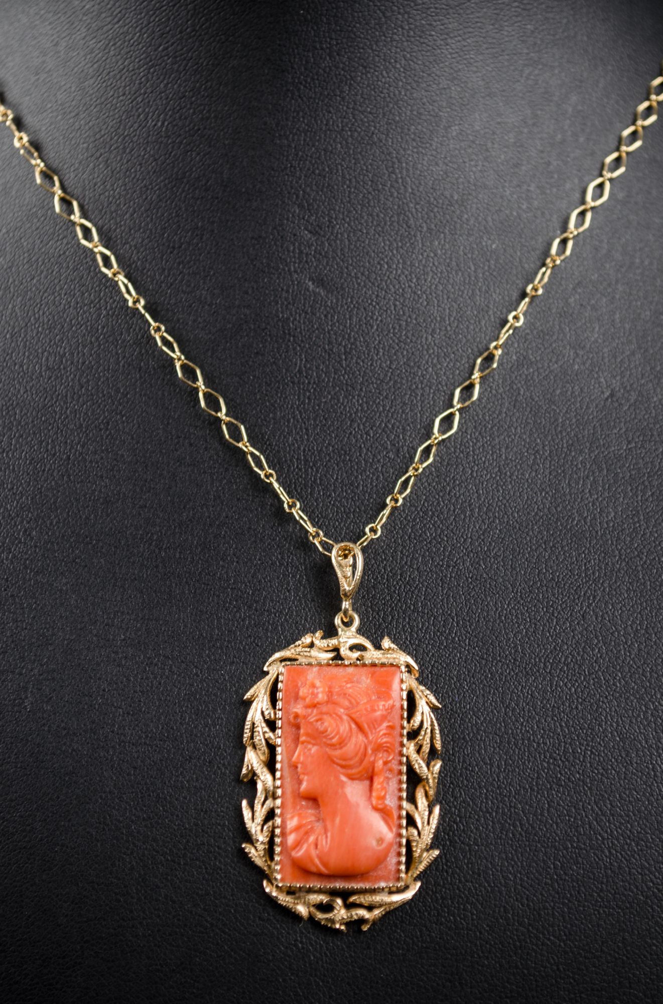 PENDENTE in oro giallo 18 Kt, corallo inciso raffigurante "profilo femminile" con catena in oro giallo 18 Kt. (g. 10). Sicilia XX secolo