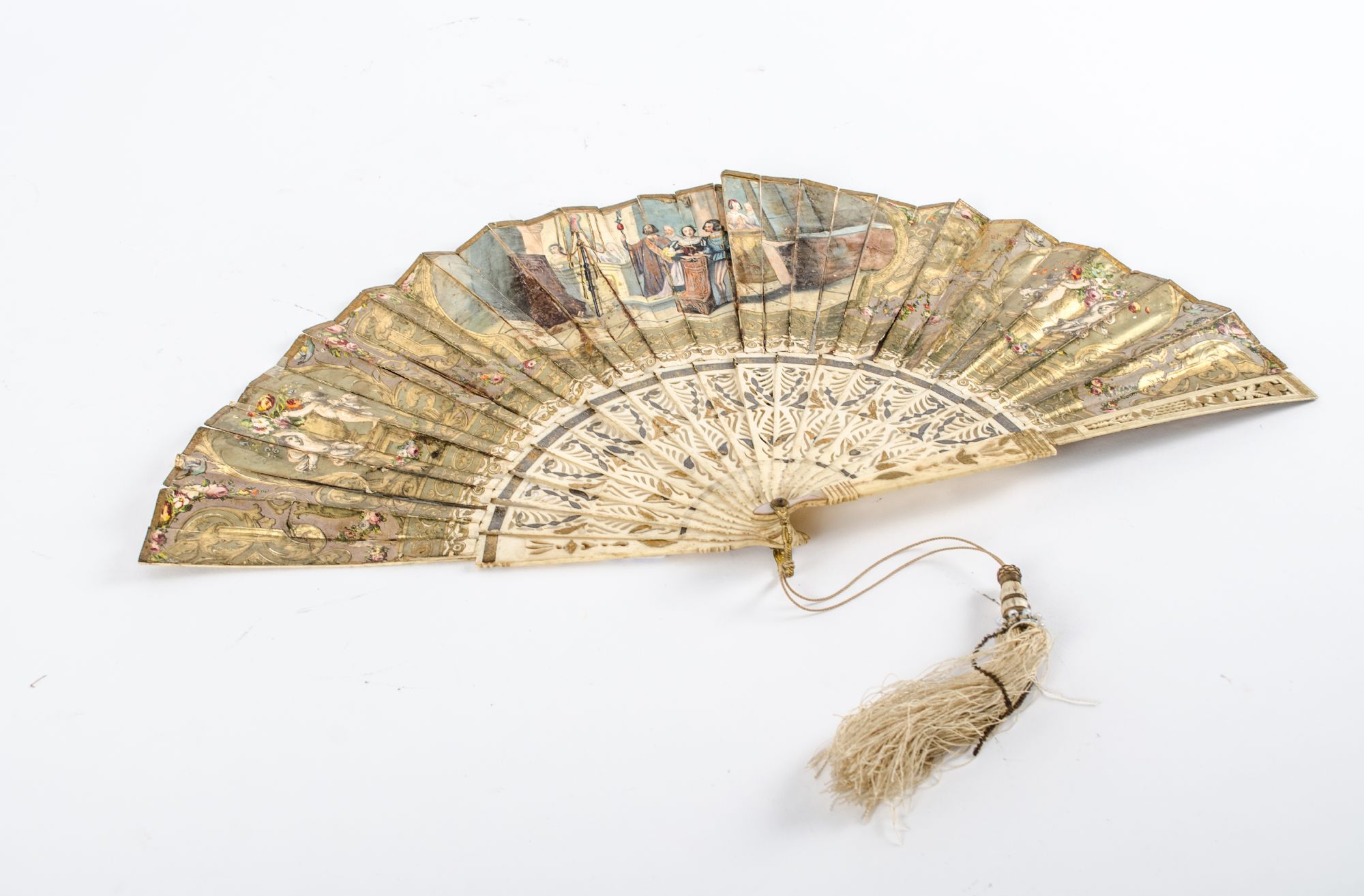 VENTAGLIO con stecche in avorio decorata e pagina in carta dipinta raffigurante "scena di corte" (rotture). XIX secolo Misure: cm 50 x 26