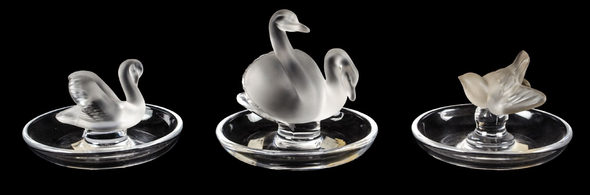 TRE SVUOTATASCHE in cristallo Lalique raffiguranti "cigno", "colomba" e "cigni". XX secolo Misure: varie
