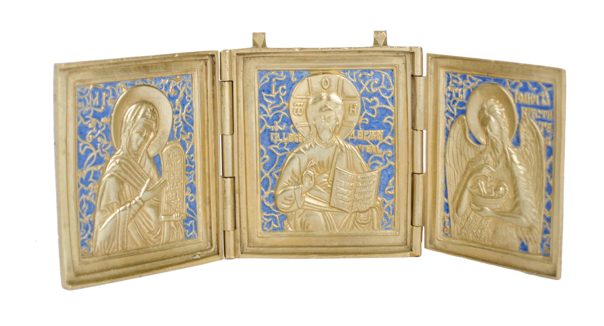 ICONA da viaggio in bronzo dorato con inserti in smalto a foggia di trittico raffigurante "La Deesis". Russia XIX secolo Misure: cm 7 x 7,5