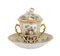 BELLA TAZZINA con coperchio e piattino in porcellana nei toni del bianco e del giallo con decori a motivo floreale e con medaglioni raffiguranti "scene galanti", lumeggiature in oro. Francia XIX secolo Misure: diametro cm 14 x h 11