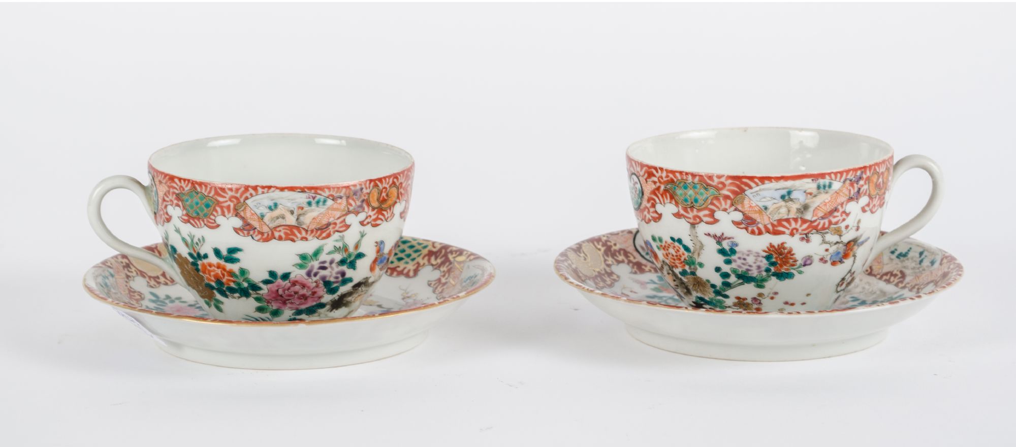 COPPIA TAZZINE con piattino in porcellana decorata a motivo floreale con volatili. Cina XIX secolo Misure: diametro cm 13,5 x h 6