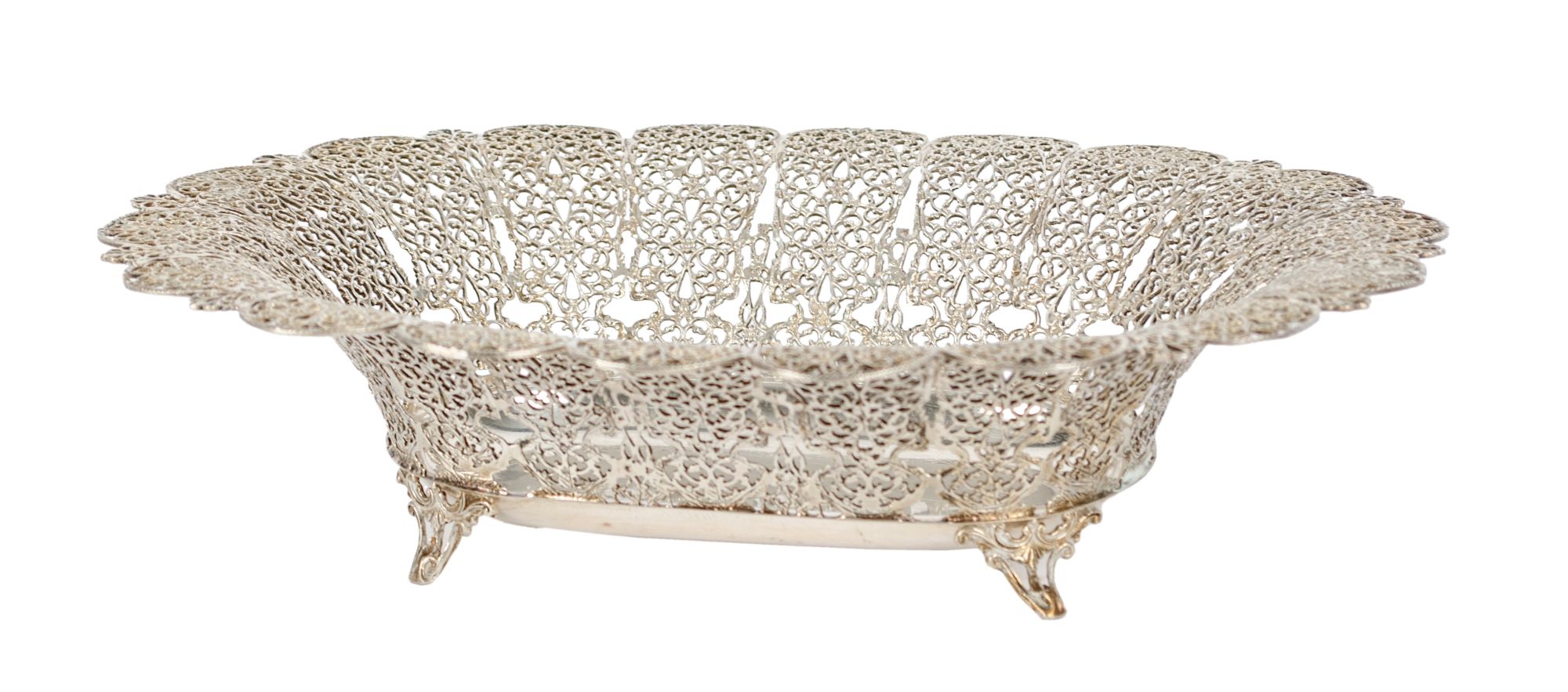 CESTINO in argento traforato (g. 449). Italia XX secolo Misure: cm 29 x 23 x h 7