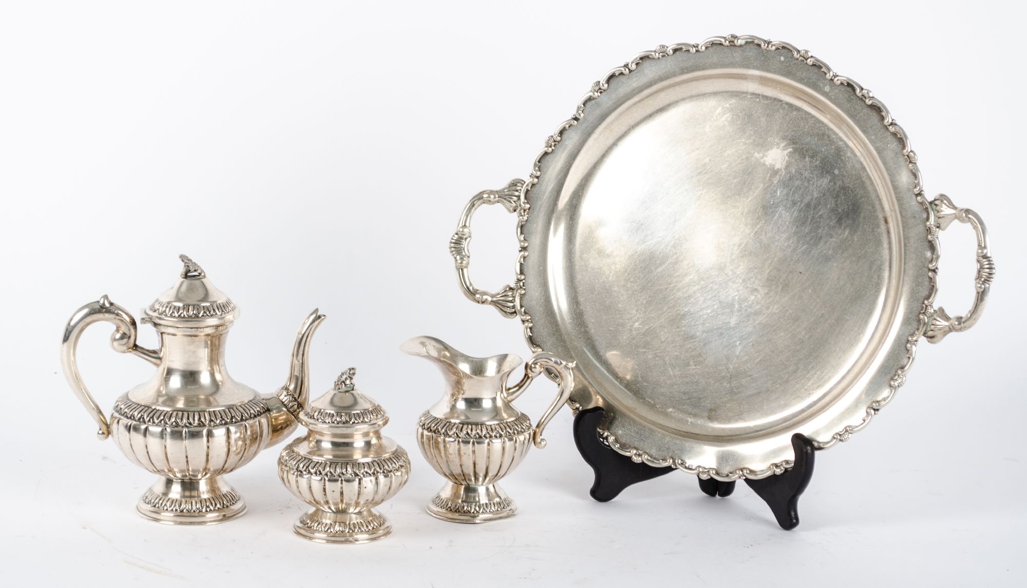 SERVIZIO in argento composto da VASSOIO, CAFFETTIERA, LATTIERA e da ZUCCHERIERA (g. 984). Italia XX secolo Misure: varie