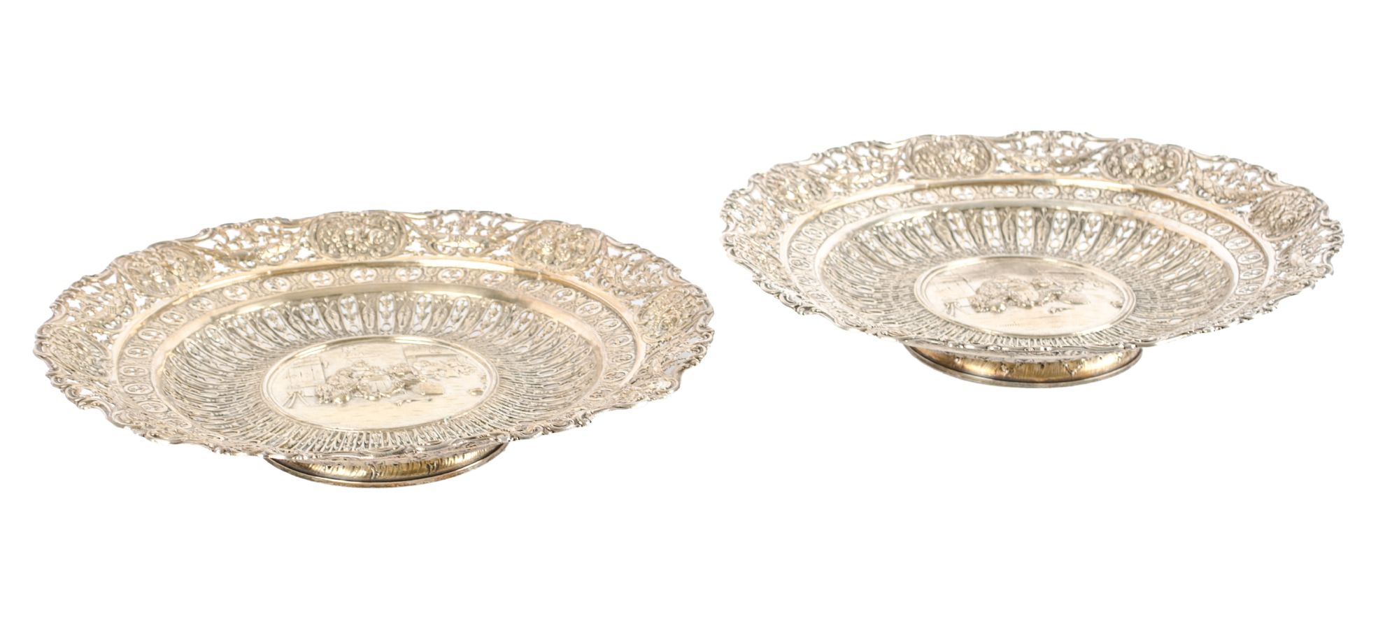 COPPIA PIATTI in argento traforato e sbalzato raffiguranti "interno di...