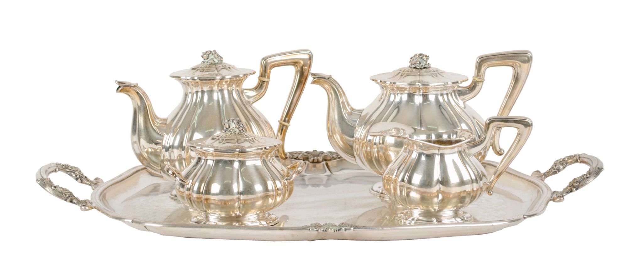 SERVIZIO in argento composto da CAFFETTIERA, THEIERA, LATTIERA, ZUCCHERIERA e da VASSOIO (g. 5107). XX secolo Misure: varie