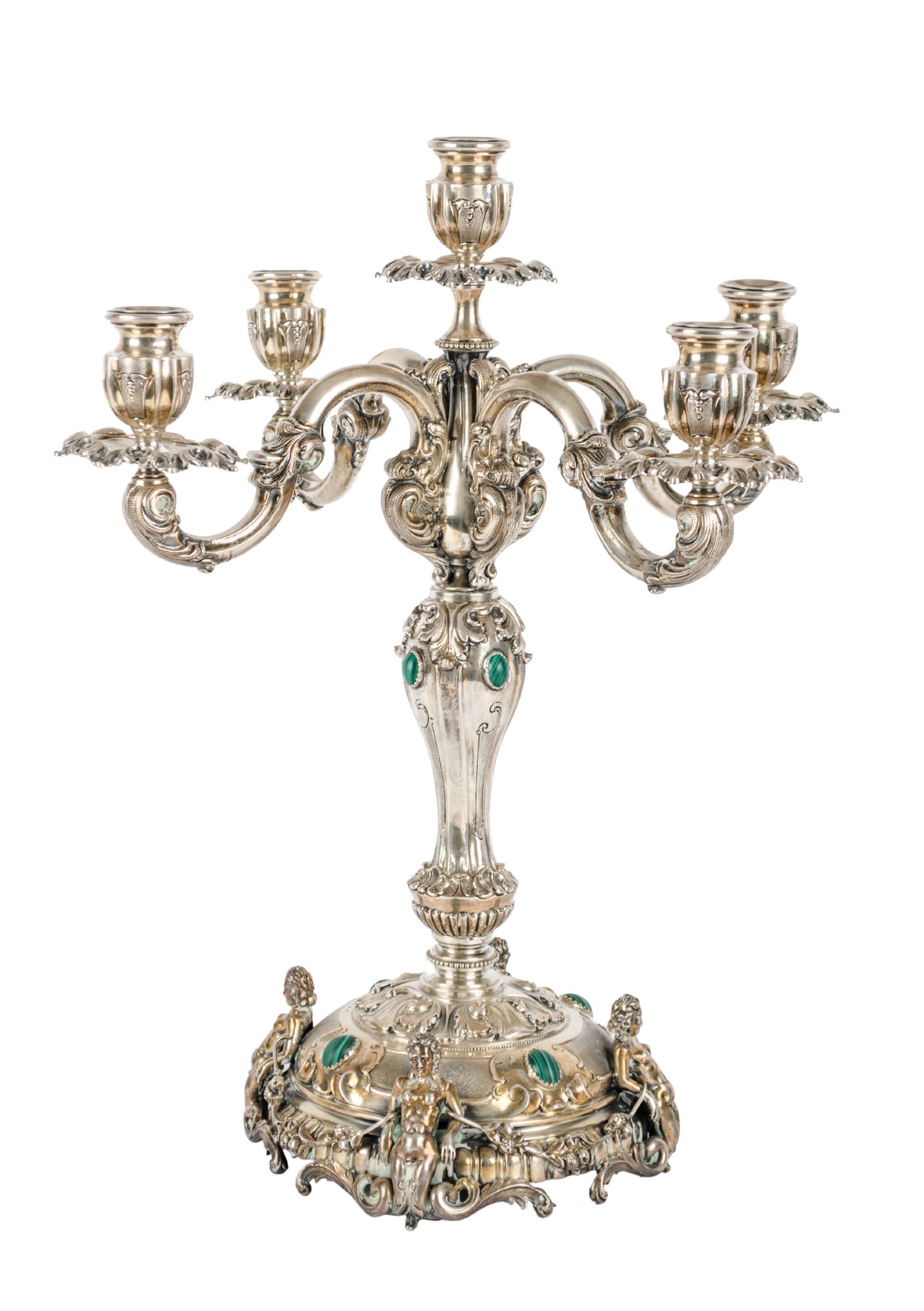BEL CANDELABRO a cinque luci in argento riccamente sbalzato a mano con inserti in malachite (g. 3312). Italia XX secolo Misure: h cm 48