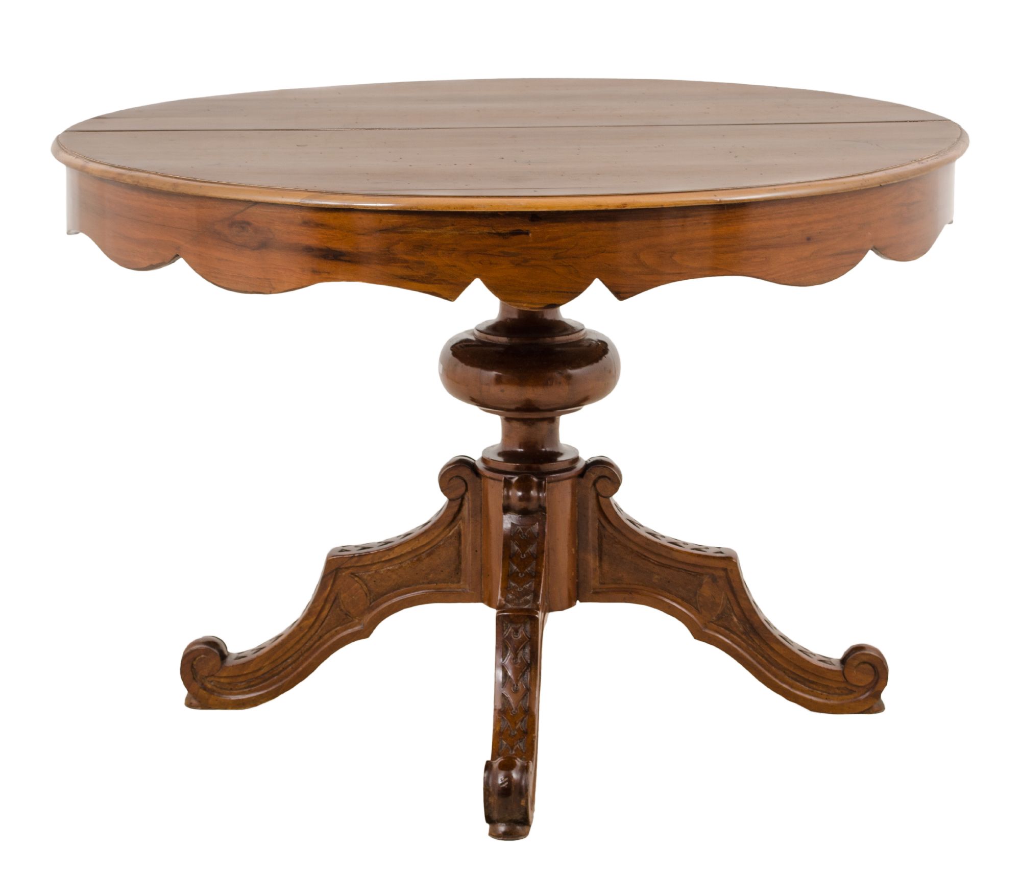 TAVOLO tondo in noce con fusto a colonna e quattro piedi (tre prolunghi). Sicilia XIX secolo Misure: diametro cm 116 x h 80