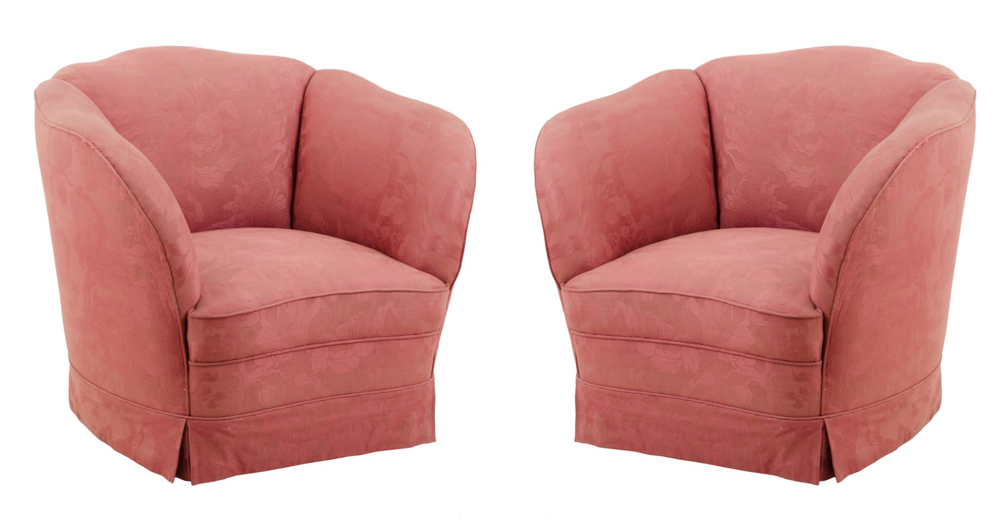 COPPIA POLTRONE tappezzate nei toni del rosa. XX secolo Misure: cm 94 x 86 x h 80