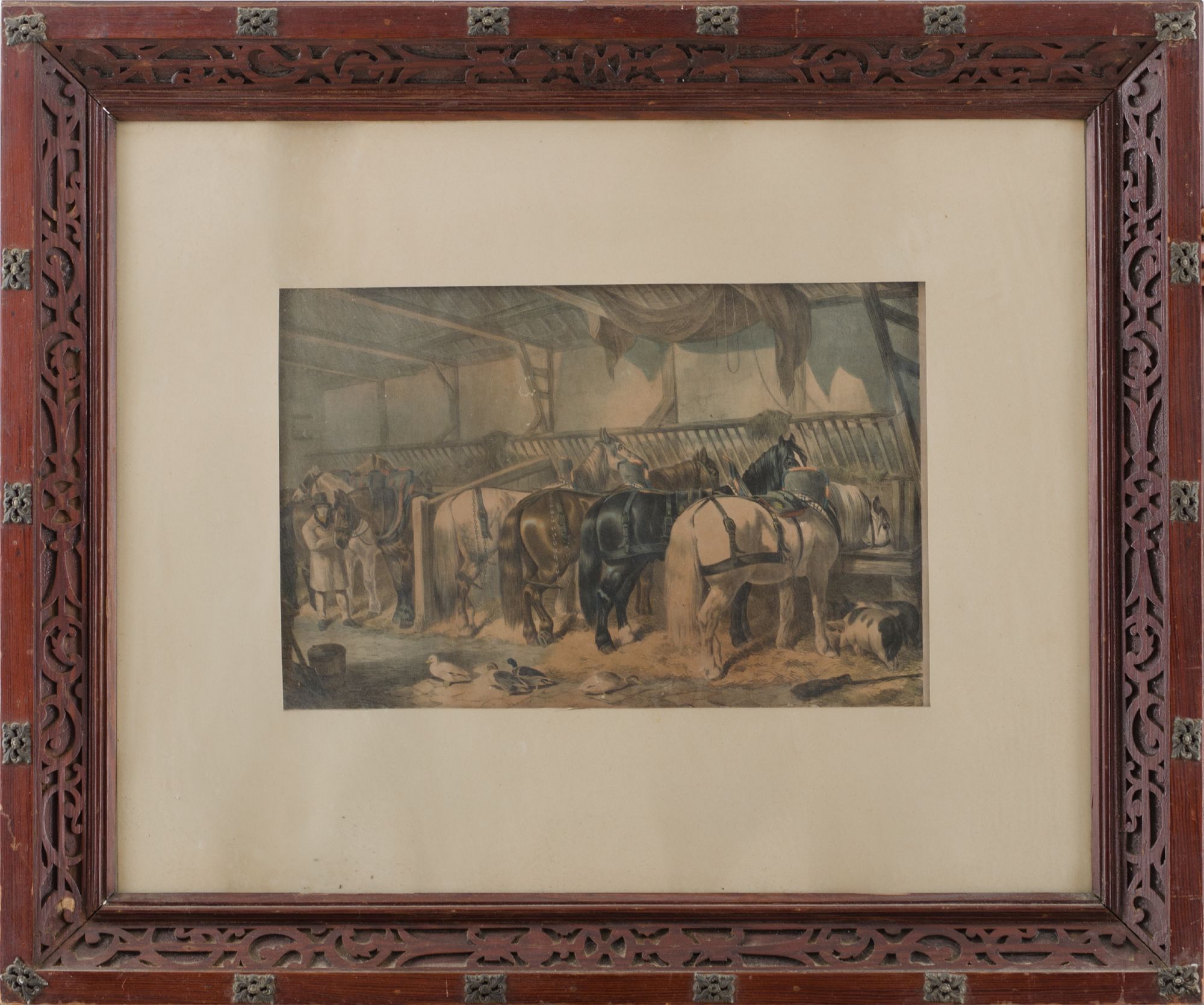 STAMPA a colori "cavalli nella stalla" entro cornice in palissandro. Spagna periodo Liberty primi '900 Misure: cm 32 x 50