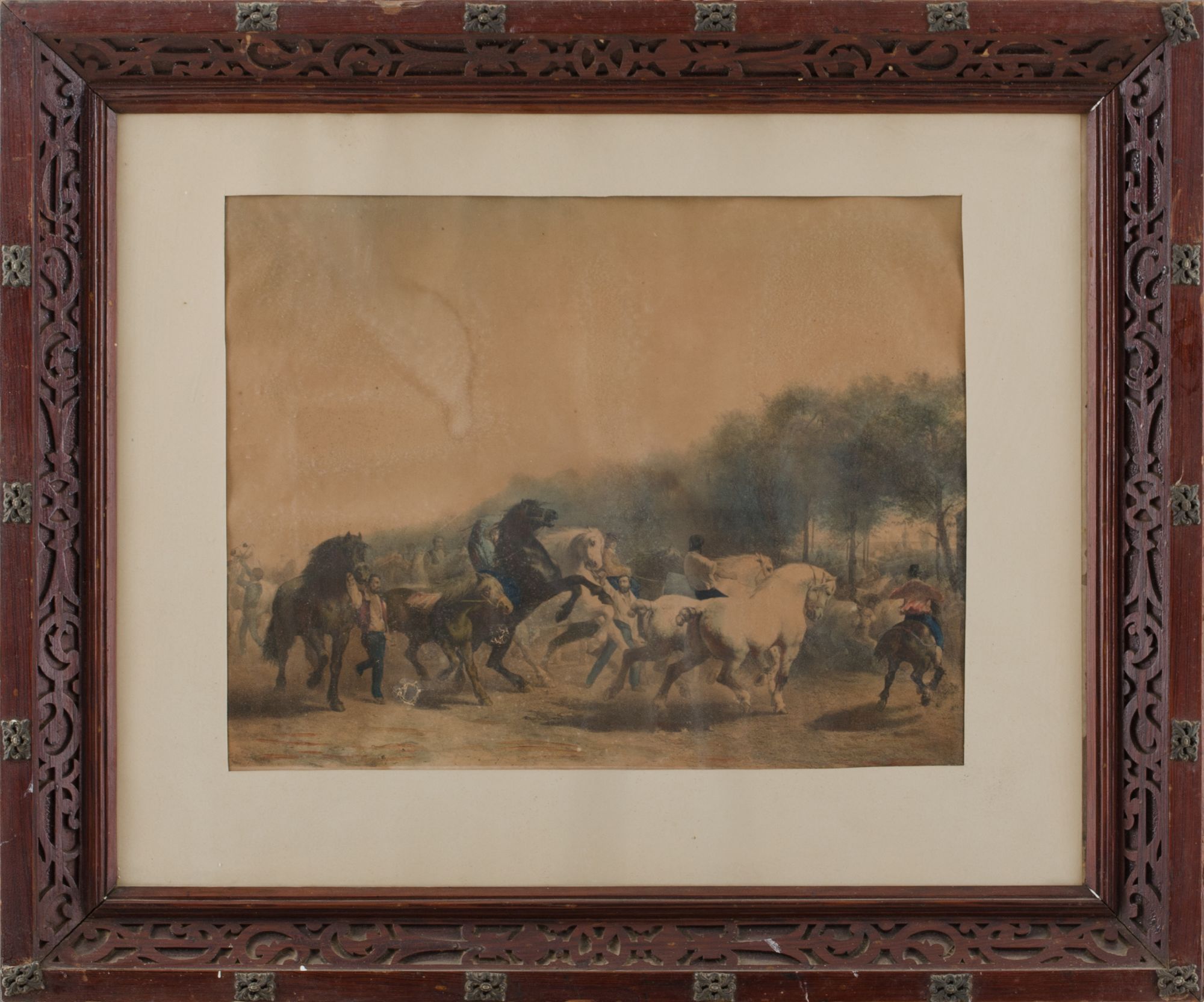 STAMPA a colori "paesaggio con cavalli" entro cornice in palissandro. Spagna periodo Liberty primi '900 Misure: cm 44 x 56,5